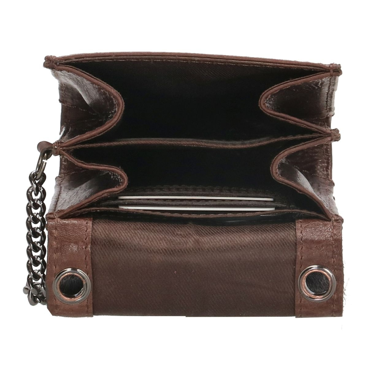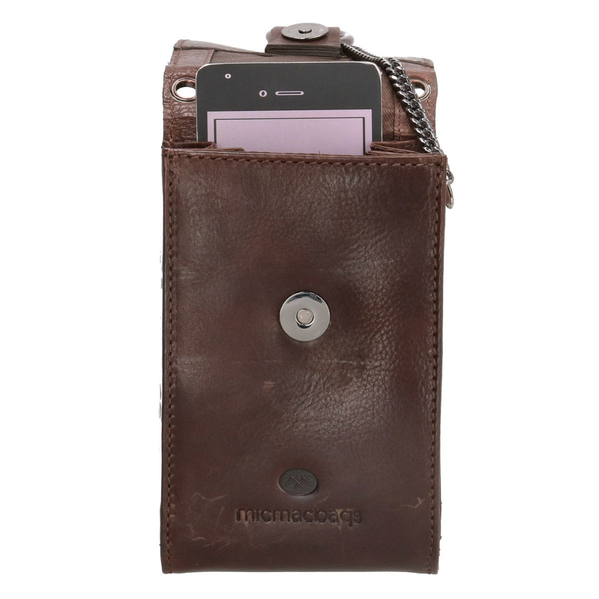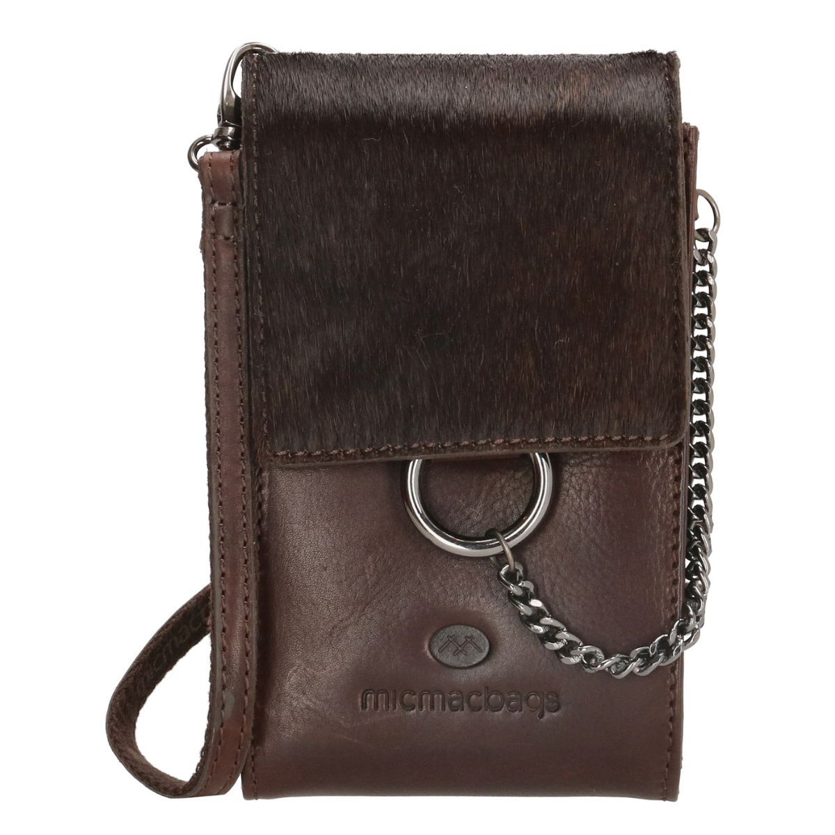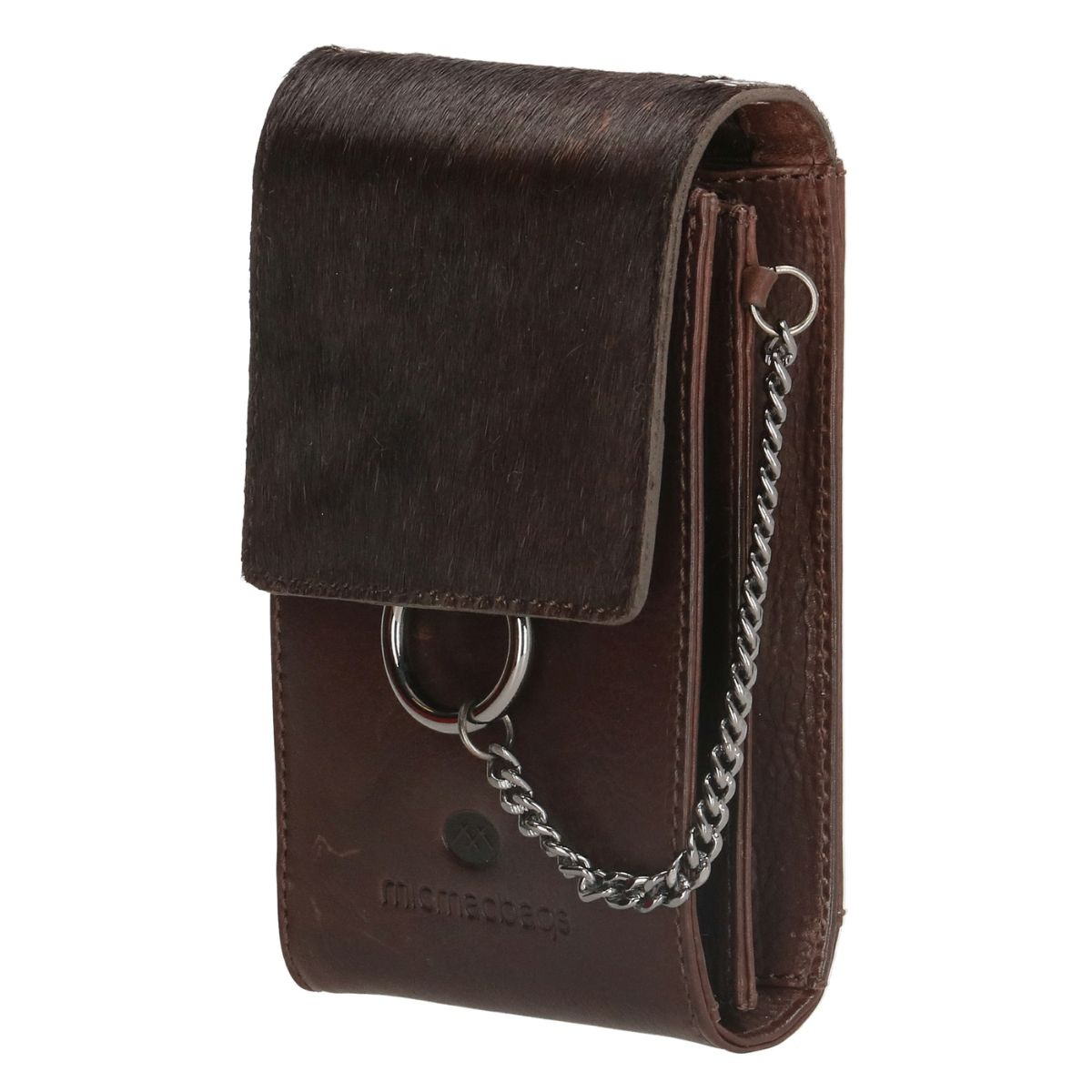Tmavohnedá dámska kožená crossbody kabelka na mobil Micmacbags z kolekcie Mendoza. Kabelka má klopu so zapínaním na magnetickú patentku. Vnútro je rozdelené na dva oddelené priečinky, do ktorých sa zmestia najnutnejšie veci, ktoré potrebujete: mobil, kľúče a karty. Táto kabelka je jedinečná vďaka kožušine na prednej klope a striebornej retiazke, ktorá je pripevnená k prednej časti. Kabelka má odnímateľný, nastaviteľný popruh pre nosenie cez telo (crossbody). Značka Micmacbags je inšpirovaná rôznymi krajinami a kultúrami. Kolekcia Mendoza od tejto značky spája westernovú atmosféru s elegantným moderným štýlom. Kabelky sú vyrobené z hovädzej kože, čo im dodáva prirodzený vzhľad.
