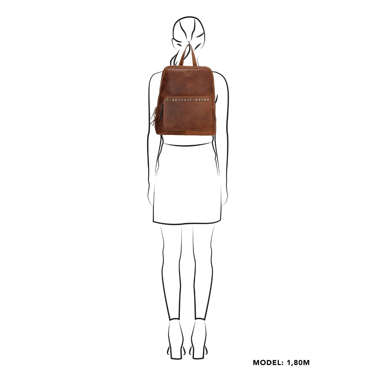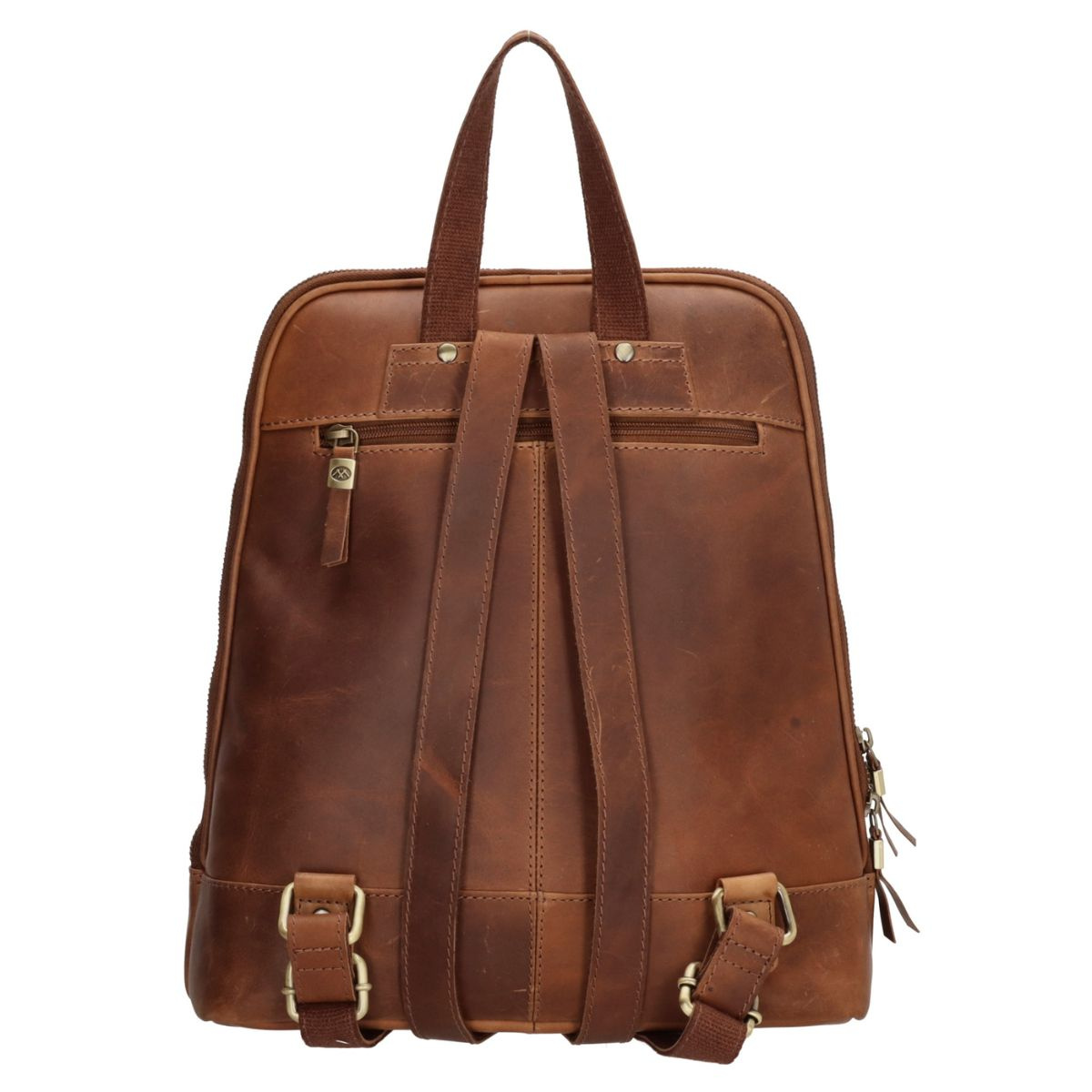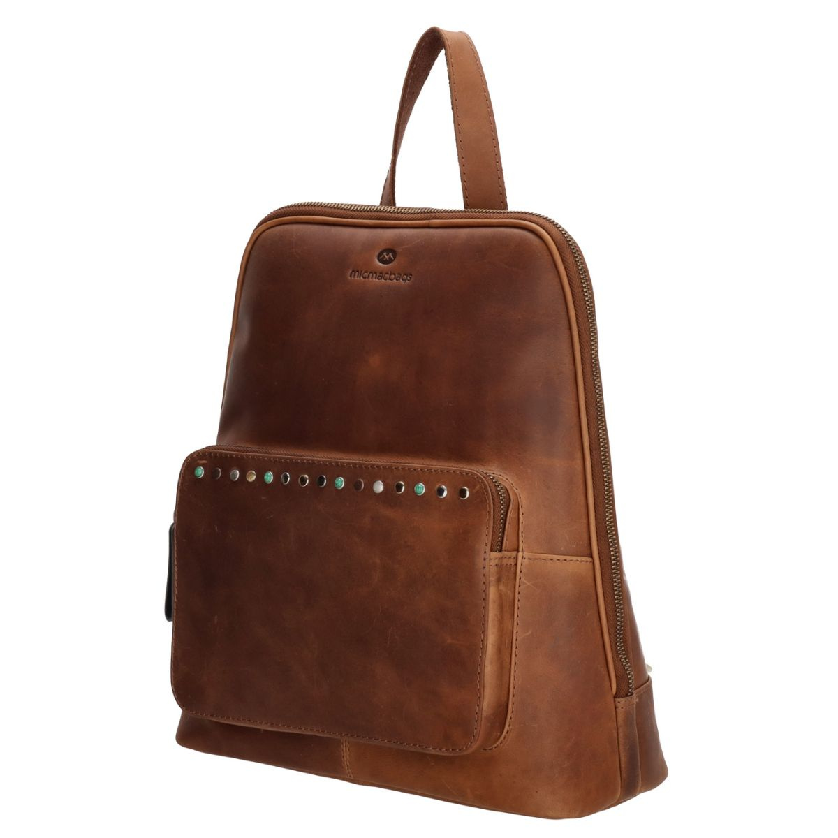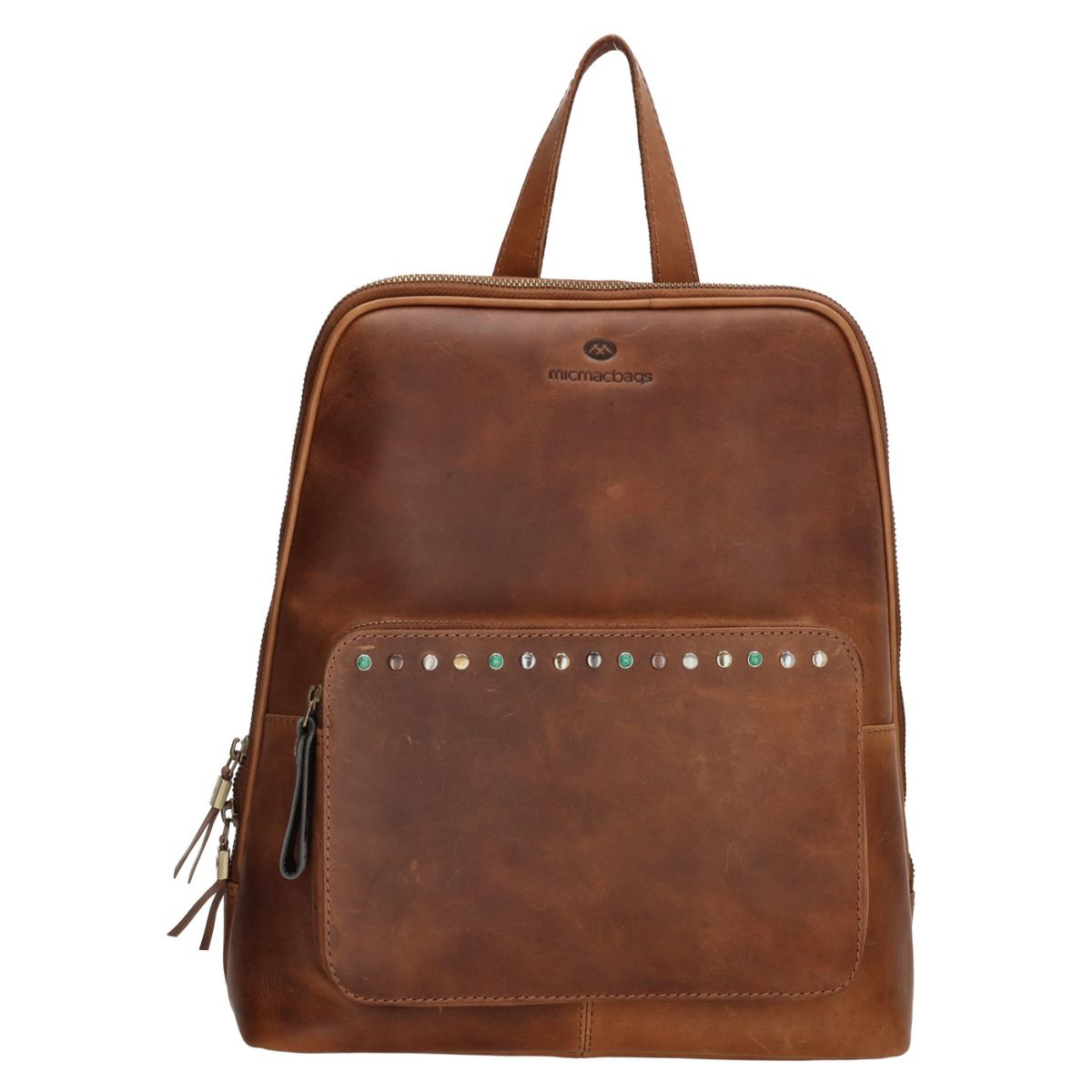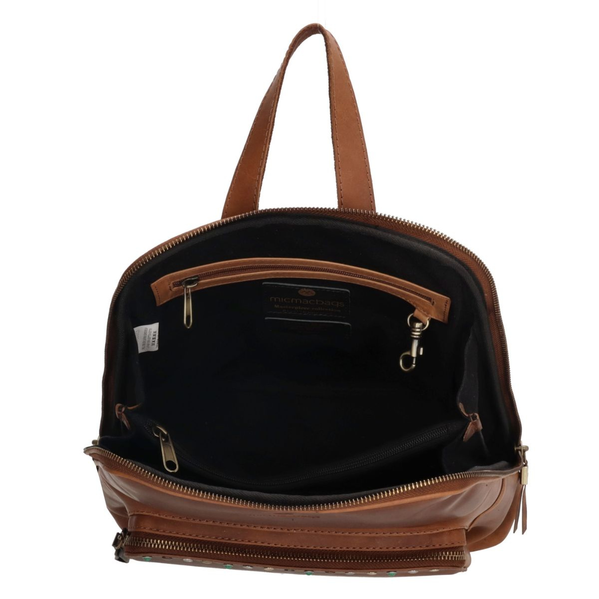 Dámsky kožený batoh (ruksak) Micmacbags v koňakovej farbe z krásnej kolekcie Masterpiece. Hlavný úložný priestor má zapínanie na zips. Zmestí sa do neho formát A4, vo vnútri nájdete: jedno malé otvorené vrecko, organizér na perá, jedno mini otvorené vrecko, jedno vrecko na zips, v strede je priehradka (vrecko) na zips. Na prednej strane batohu je jedno vrecko na zips, na ktorom je pekný malý kožený prívesok s kvetinovou potlačou a na tomto vrecku sú ešte aj farebné aplikácie. Na zadnej strane batohu sa nachádza vrecko na zips, rukoväť a nastaviteľné ramenné popruhy. Tento kožený batoh je ideálny na cesty, do práce aj na voľný čas – všade doladí Váš štýl.