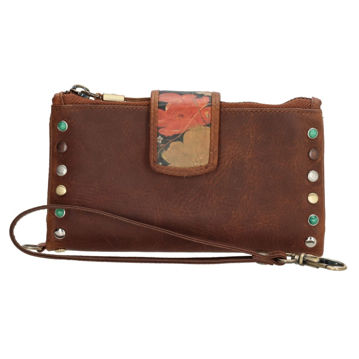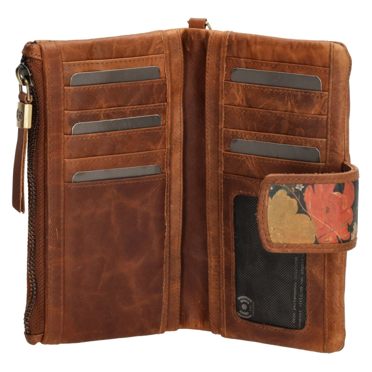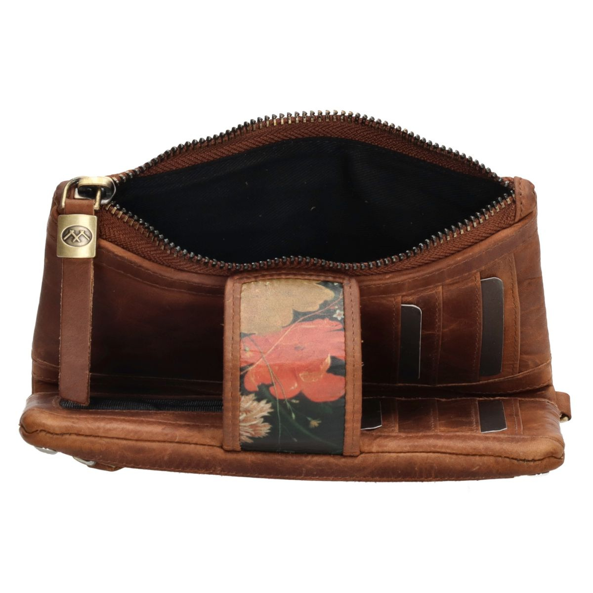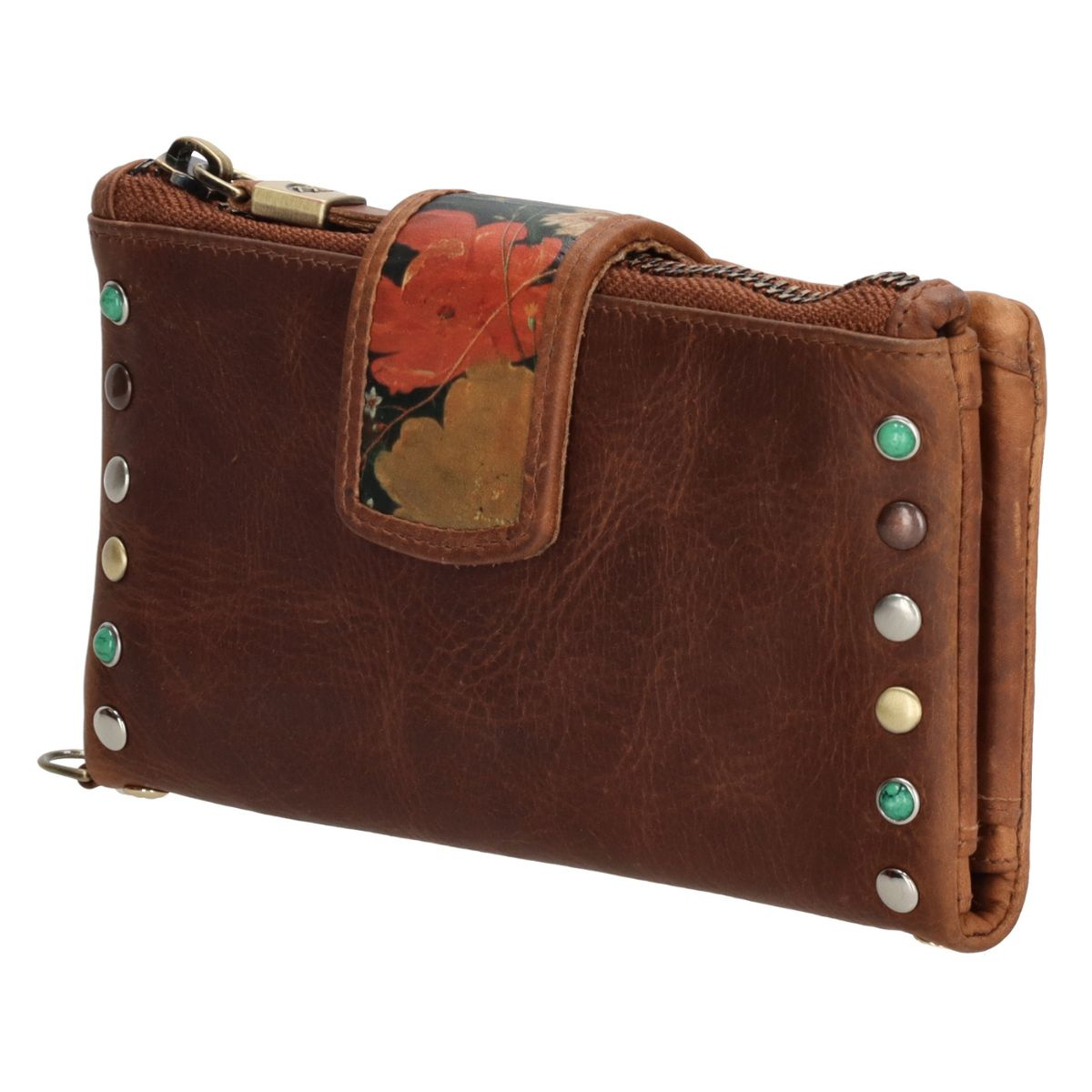 Dámska kožená peňaženka v koňakovej farbe z kolekcie Masterpiece od značky Micmacbags ponúka dostatok priestoru na všetko, čo potrebujete. Vyrobená z vysoko kvalitnej pravej prírodnej kože. Na peňaženke sú farebné ozdobné detaily. Zapínanie je s krásnym kvetinovým vzorom na všitý magnet. Hlavný úložný priestor obsahuje priečinky na karty, bankovky a fotografiu (sieťovaný priečinok), prípadne aj mobil. Peňaženka má vrecko na zips, ktoré môžete využívať napr. ako mincovník. Súčasťou peňaženky je kožený, odopínateľný remienok na zápästie. Na zadnej strane peňaženky je vrecko na zips. Tento nádherný a jedinečný doplnok je ideálny aj ako darček.