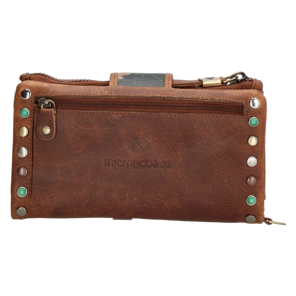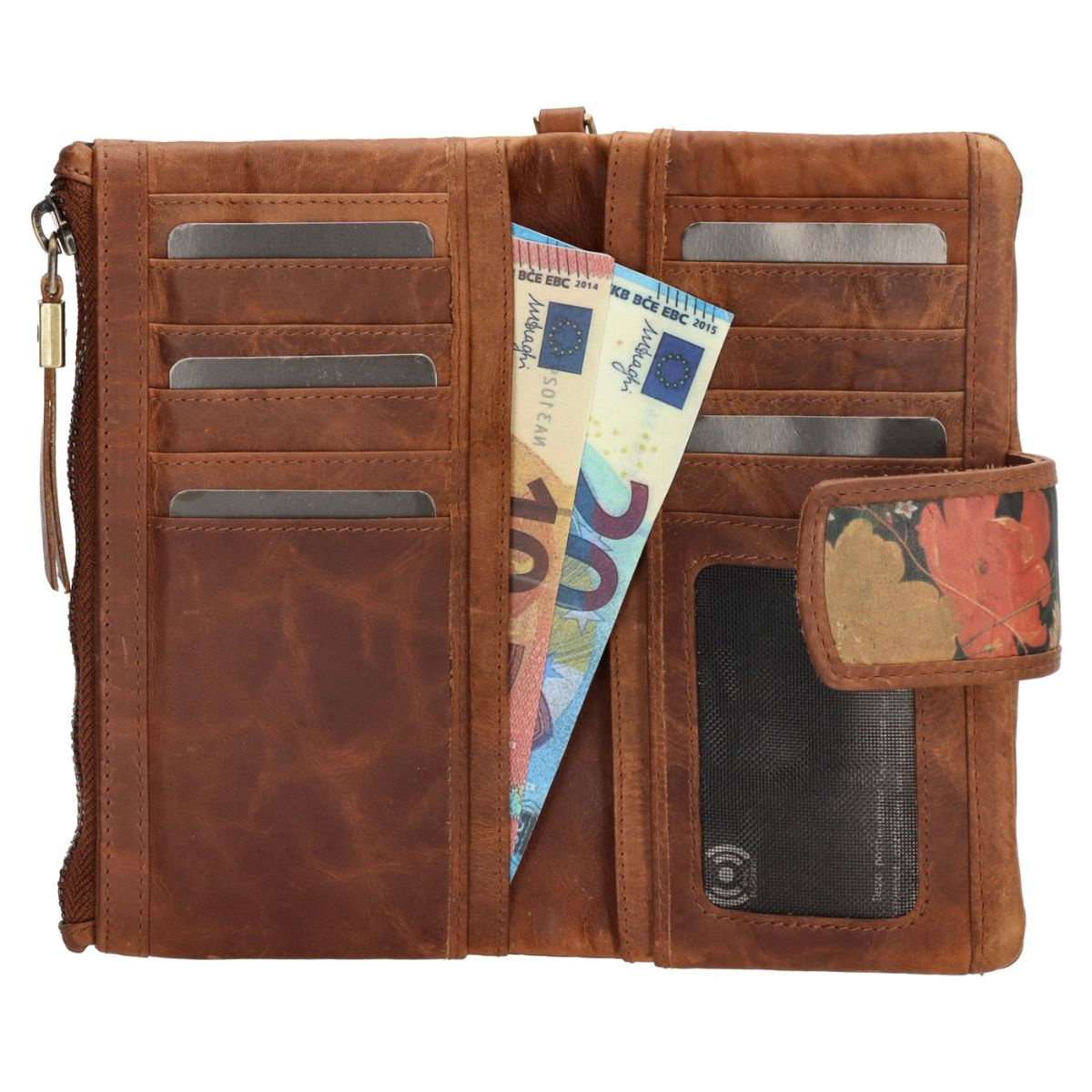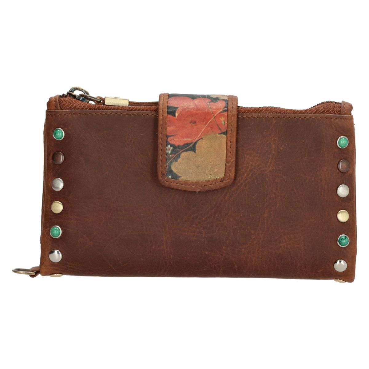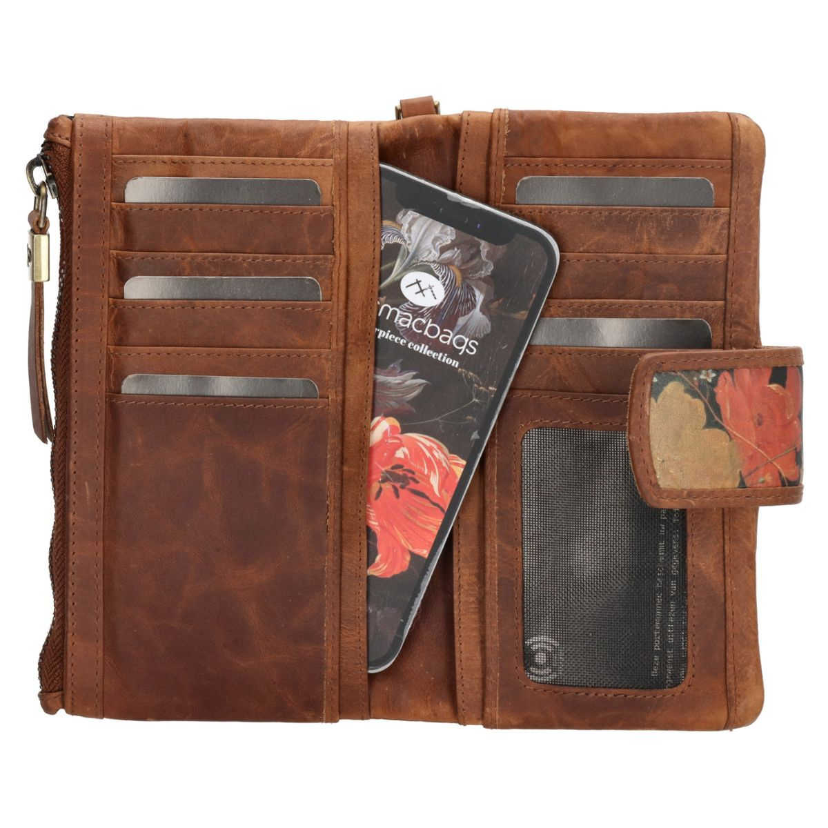 Dámska kožená peňaženka v koňakovej farbe z kolekcie Masterpiece od značky Micmacbags ponúka dostatok priestoru na všetko, čo potrebujete. Vyrobená z vysoko kvalitnej pravej prírodnej kože. Na peňaženke sú farebné ozdobné detaily. Zapínanie je s krásnym kvetinovým vzorom na všitý magnet. Hlavný úložný priestor obsahuje priečinky na karty, bankovky a fotografiu (sieťovaný priečinok), prípadne aj mobil. Peňaženka má vrecko na zips, ktoré môžete využívať napr. ako mincovník. Súčasťou peňaženky je kožený, odopínateľný remienok na zápästie. Na zadnej strane peňaženky je vrecko na zips. Tento nádherný a jedinečný doplnok je ideálny aj ako darček.