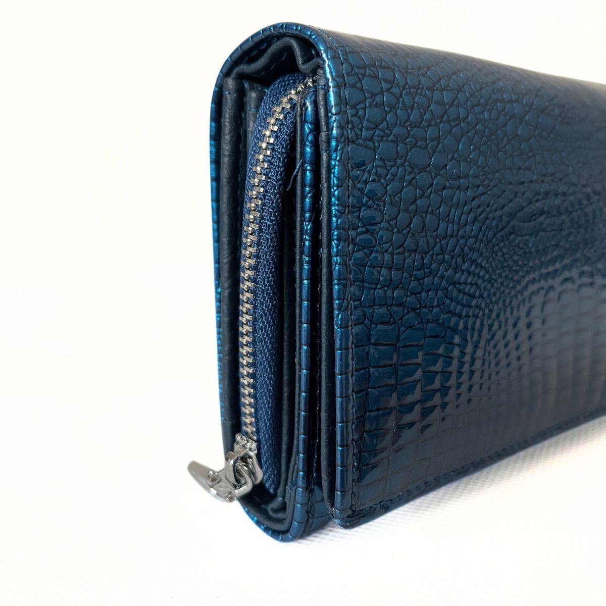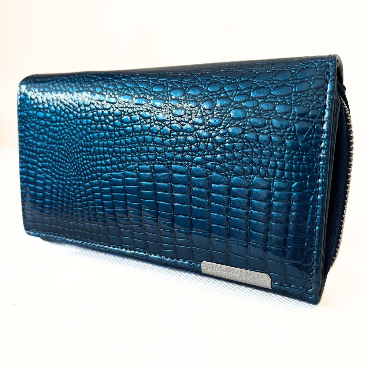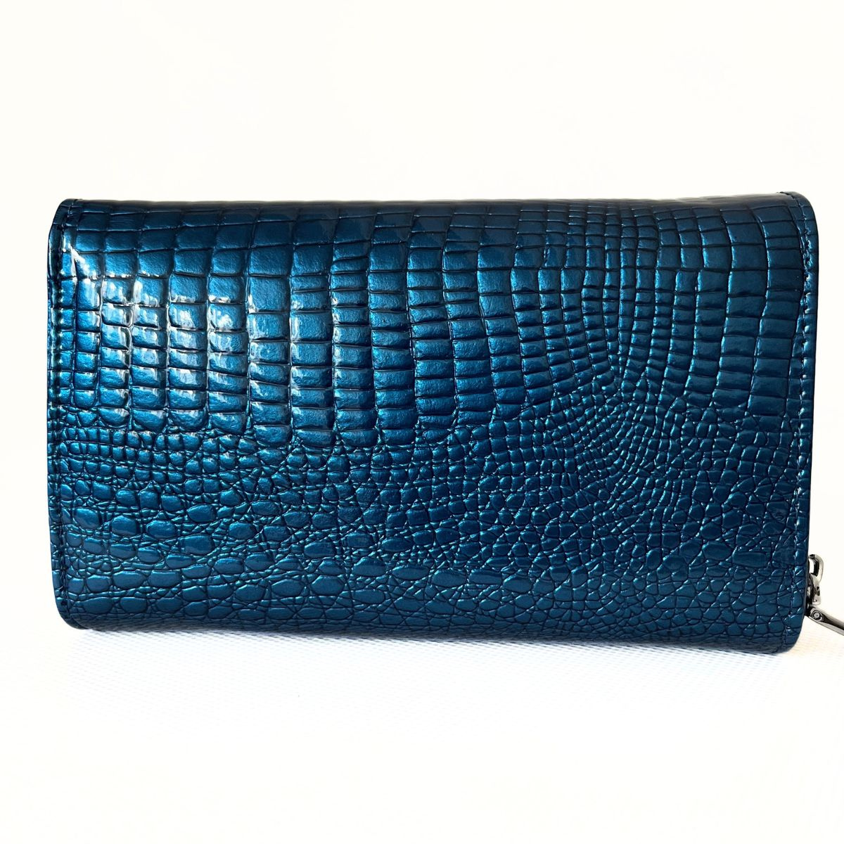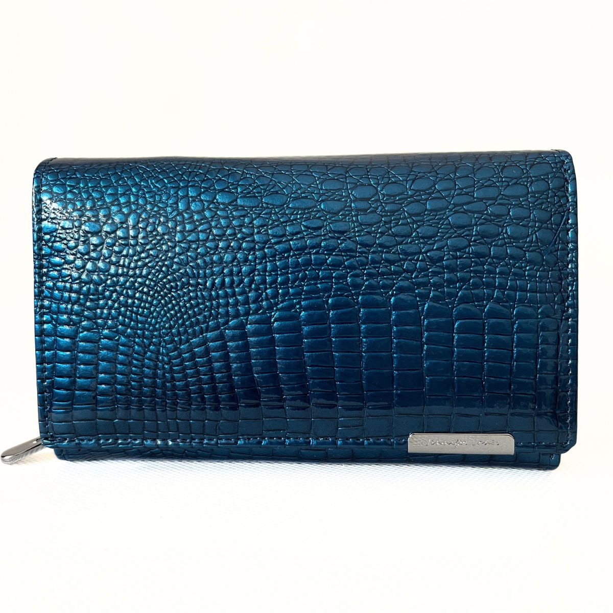 Dámska kožená lakovaná peňaženka v modrej farbe vo väčšej strednej veľkosti so štruktúrou hadej kože. Peňaženka sa zapína na patent (kovový cvok), mincovník má zapínanie na zips. Obsahuje priehradky na karty, bankovky, mince a fotografiu. Peňaženka má zabezpečenie RFID - ochrana proti krádeži dát z bezkontaktných kariet. Súčasťou peňaženky nie je krabička. Kovanie peňaženky je v striebornej farbe. Táto peňaženka vyniká modrým lakovaným povrchom, ktorý pôsobí luxusne a sofistikovane. Štruktúra hadej kože pridáva peňaženke unikátny charakter a robí z nej štýlový doplnok pre každú príležitosť.