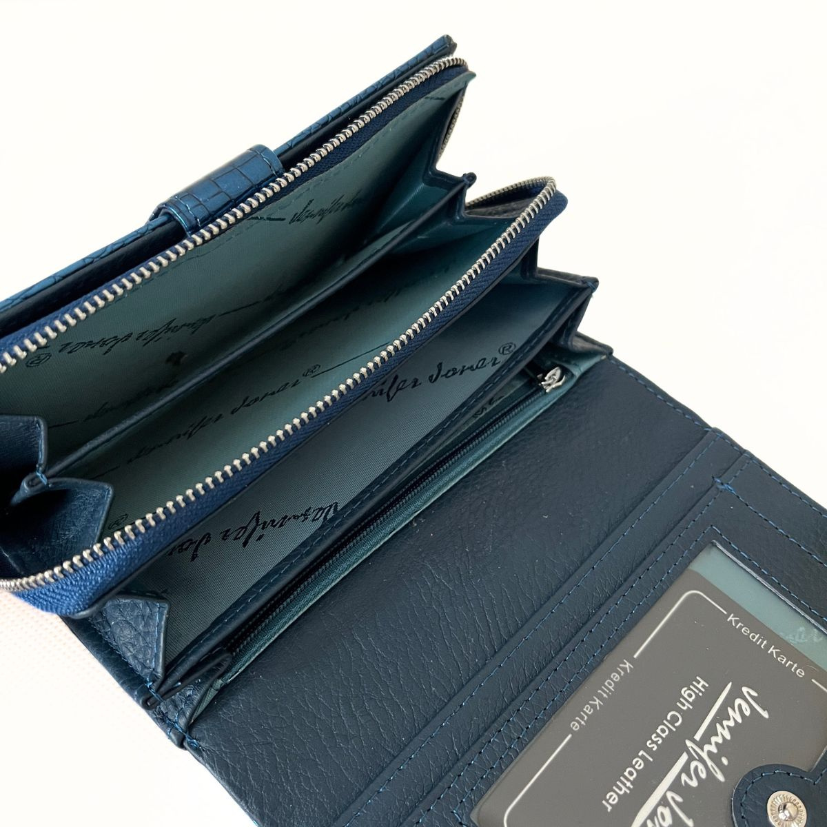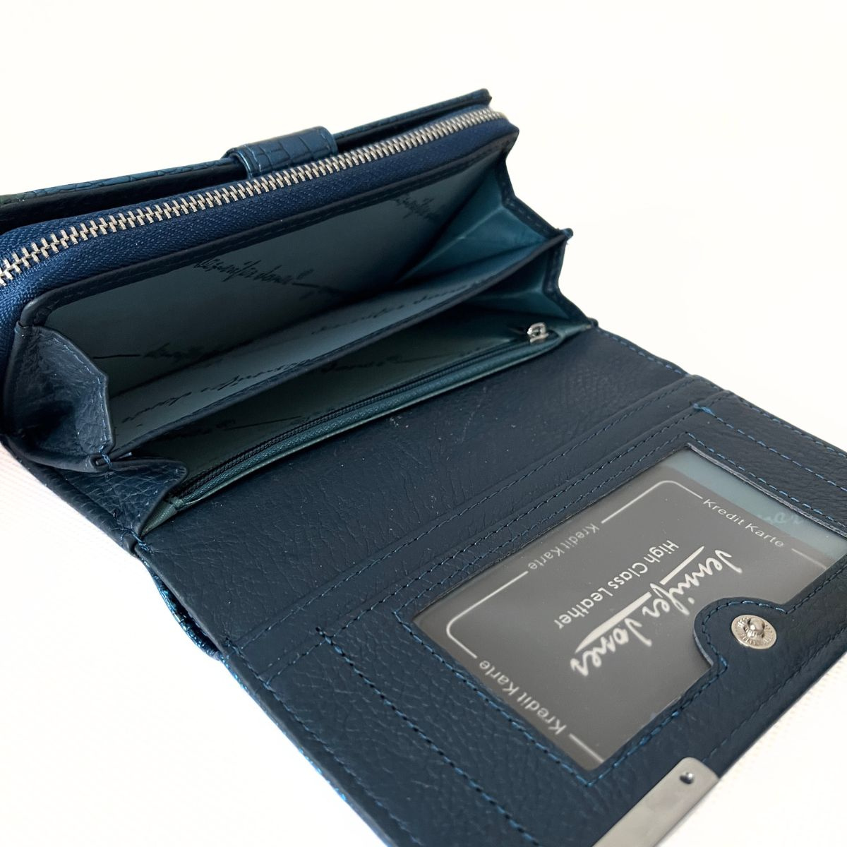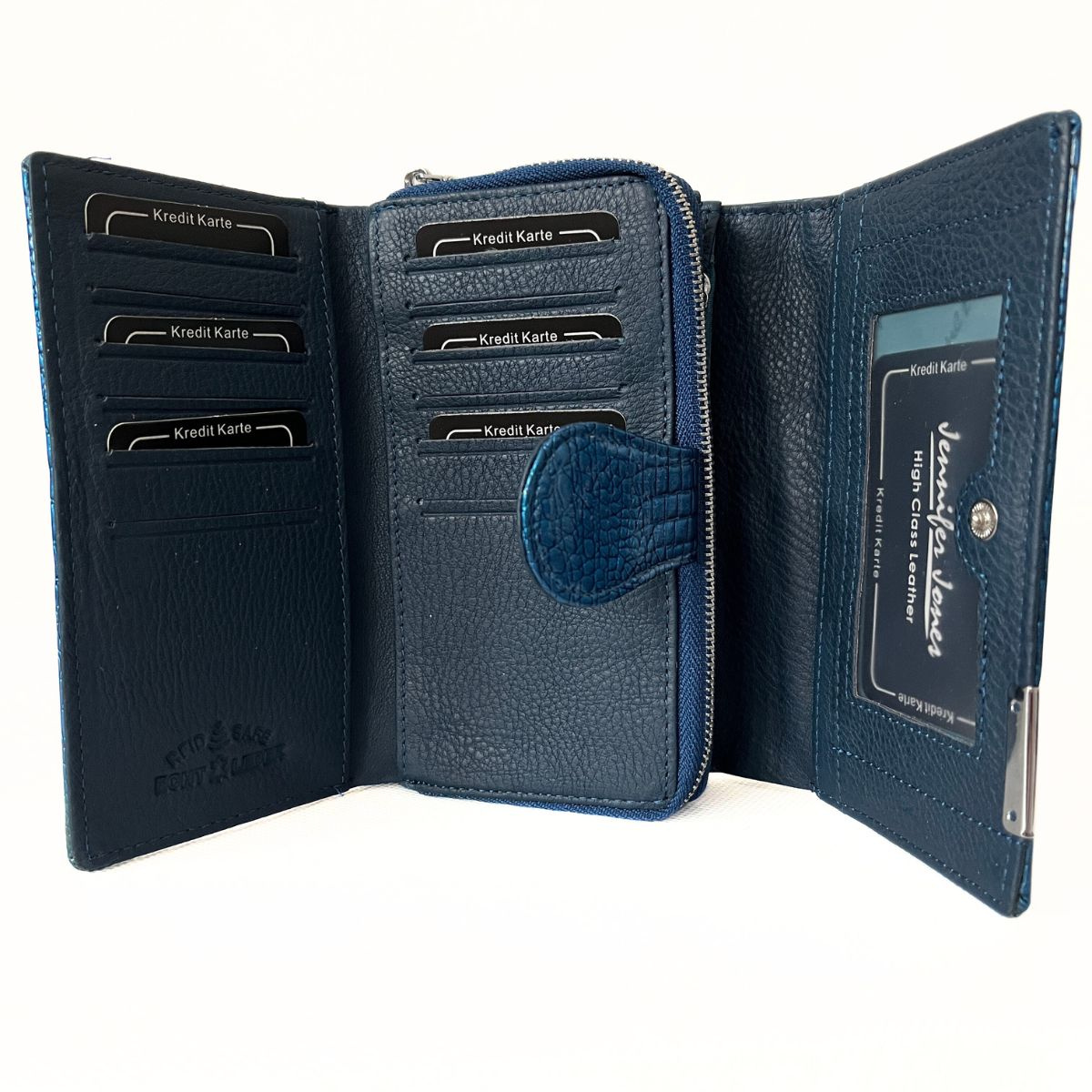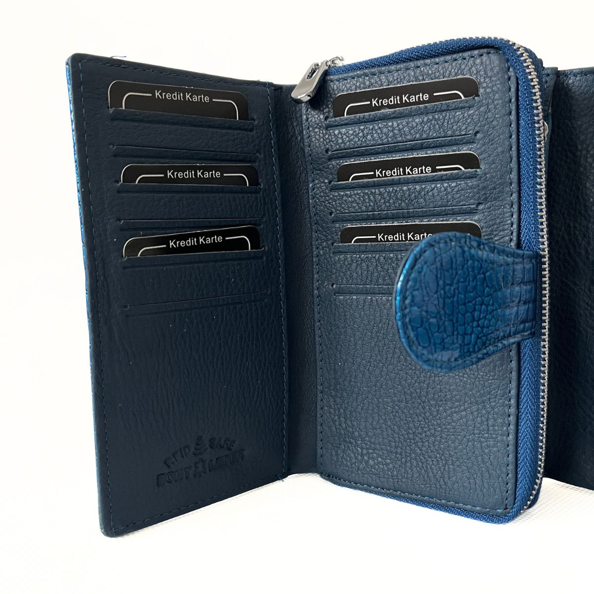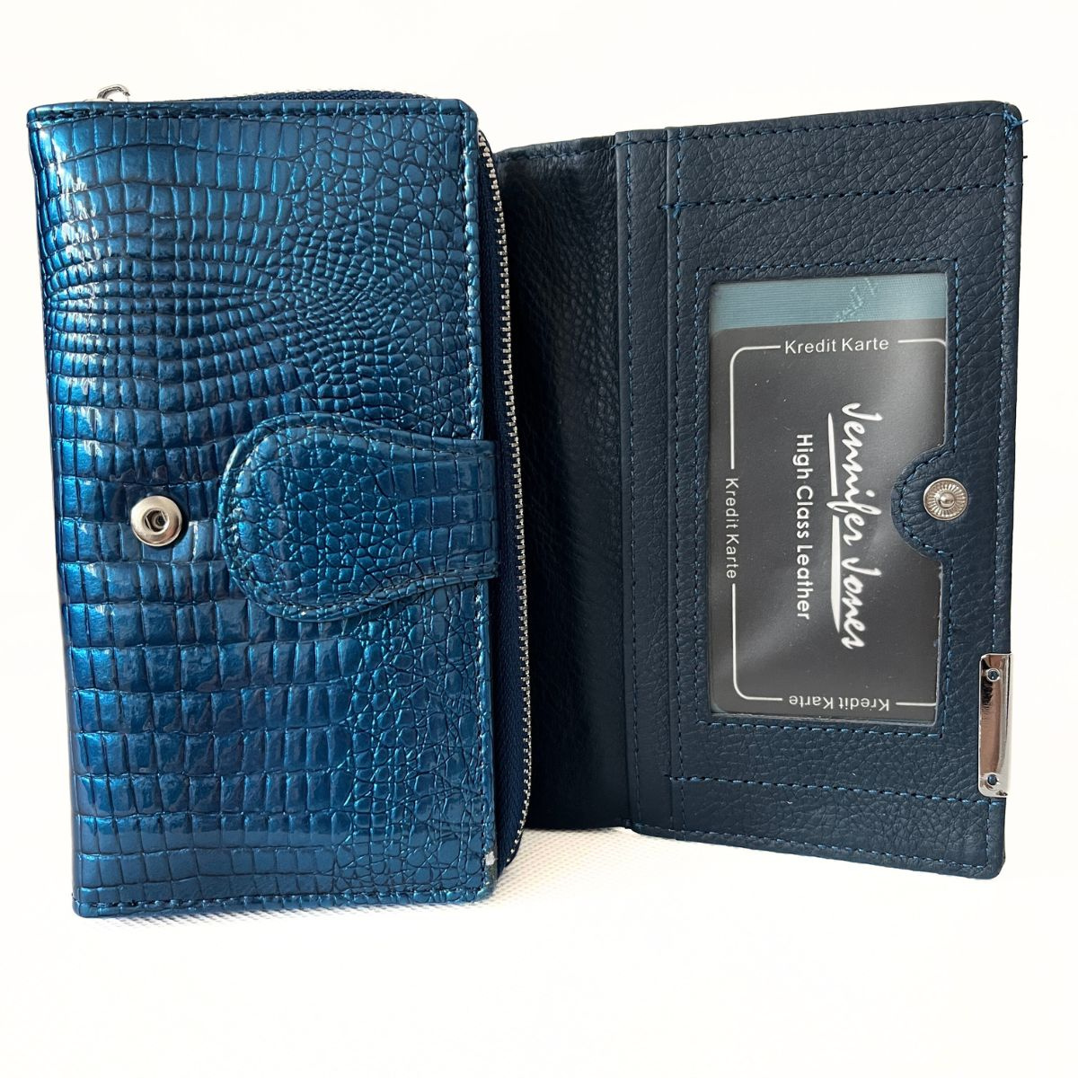 Dámska kožená lakovaná peňaženka v modrej farbe vo väčšej strednej veľkosti so štruktúrou hadej kože. Peňaženka sa zapína na patent (kovový cvok), mincovník má zapínanie na zips. Obsahuje priehradky na karty, bankovky, mince a fotografiu. Peňaženka má zabezpečenie RFID - ochrana proti krádeži dát z bezkontaktných kariet. Súčasťou peňaženky nie je krabička. Kovanie peňaženky je v striebornej farbe. Táto peňaženka vyniká modrým lakovaným povrchom, ktorý pôsobí luxusne a sofistikovane. Štruktúra hadej kože pridáva peňaženke unikátny charakter a robí z nej štýlový doplnok pre každú príležitosť.