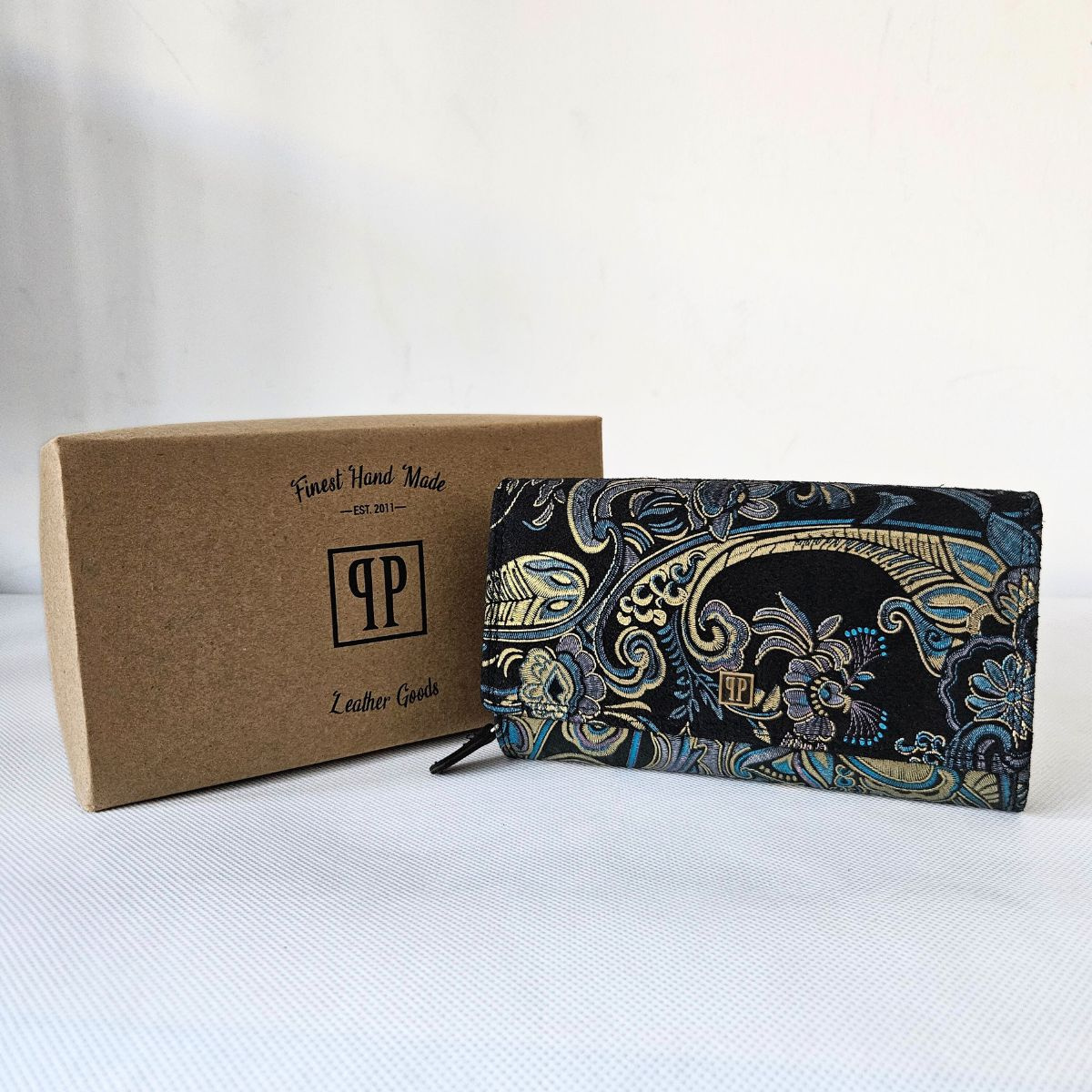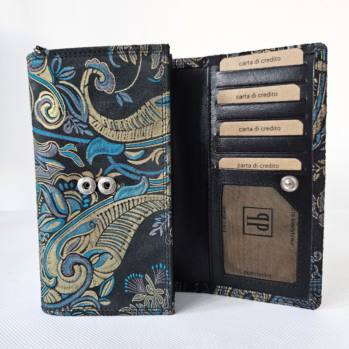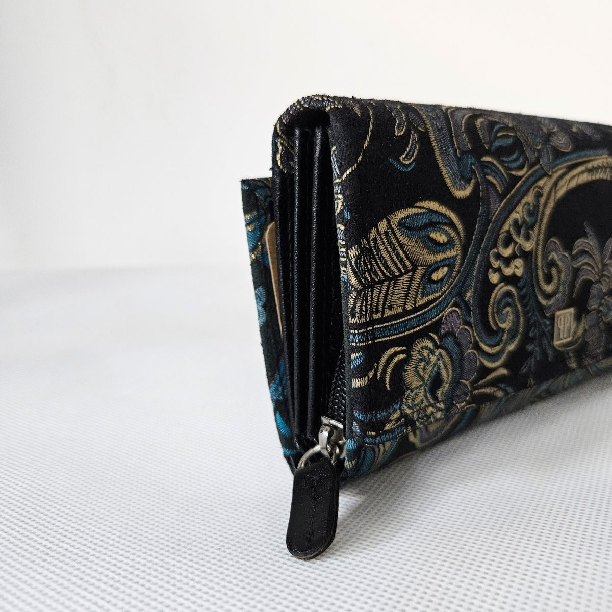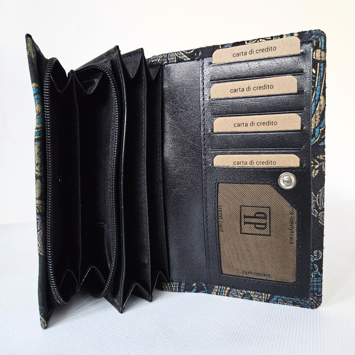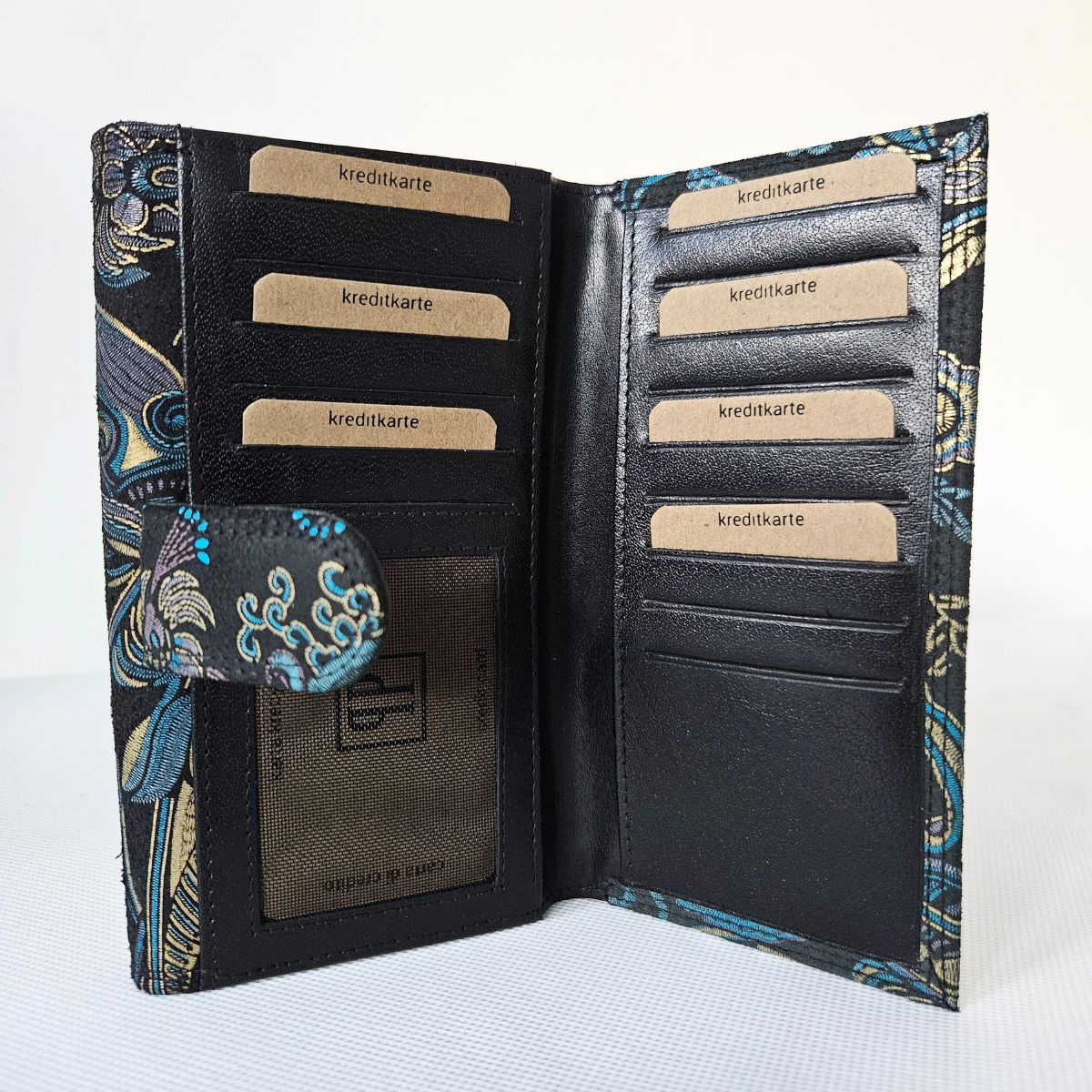 Veľká dámska kožená peňaženka s krásnou farebnou orientálnou potlačou. Vyrobená z kvalitnej pravej prírodnej kože. Peňaženka má zapínanie dvojitý patent (kovový cvok) a obsahuje priehradky na karty, bankovky, mince a fotografiu (sieťovaná priehradka). Mincovník sa zapína na zips a je rozdelený na dve časti. Zadná strana peňaženky má taktiež zapínanie na dvojitý patent a nájdete tam priehradky na karty a fotografiu (sieťovaná priehradka). Kovanie je striebornej farby. Peňaženka je zabalená v biologicky rozložiteľnej krabičke s logom značky, ideálna aj ako darček pre milovanú osobu.