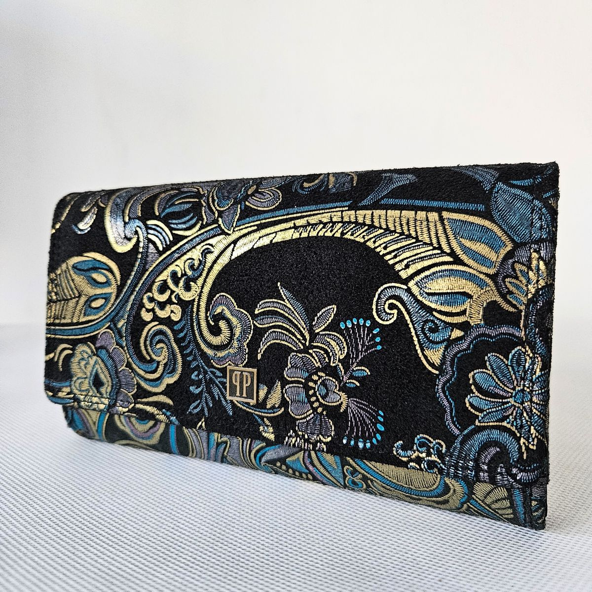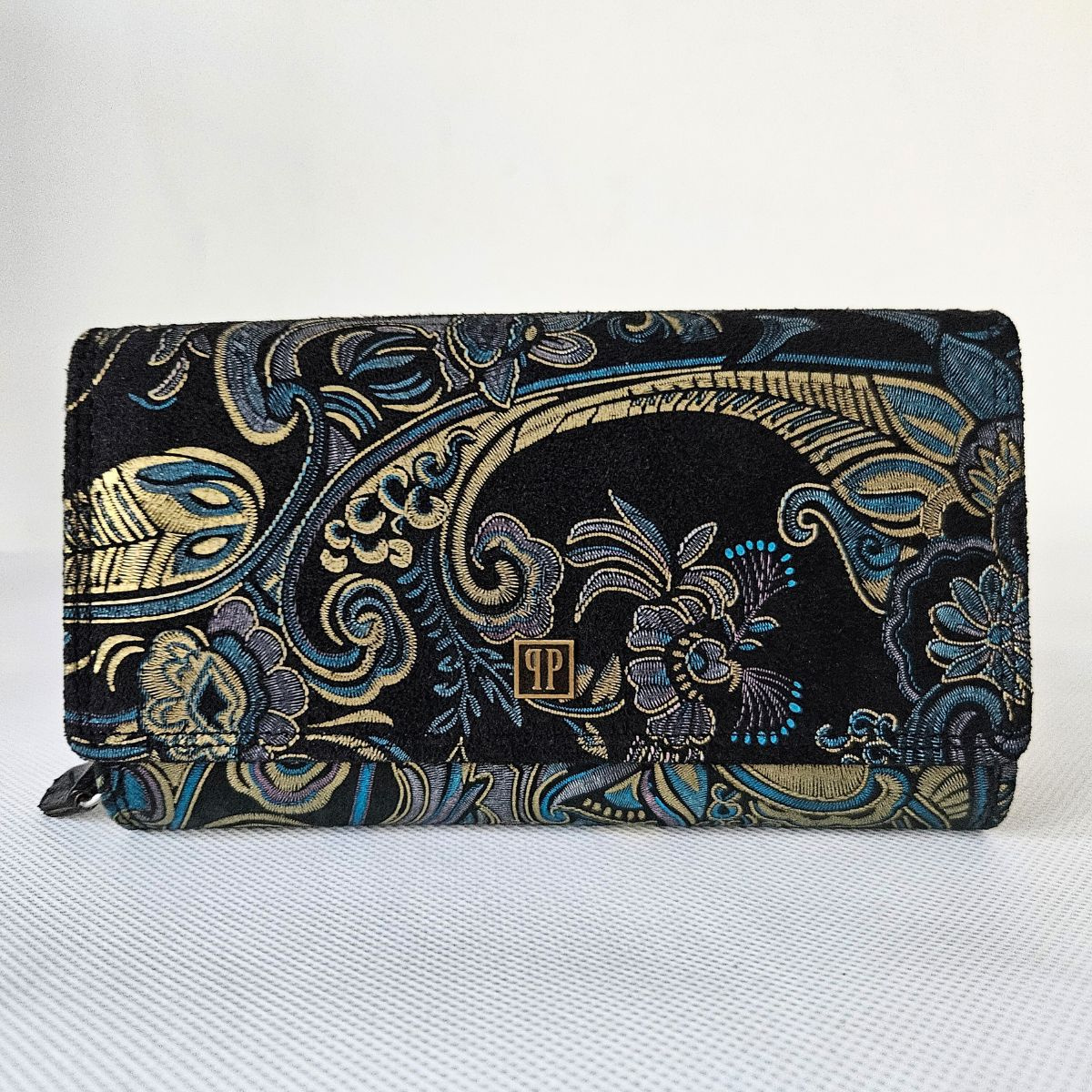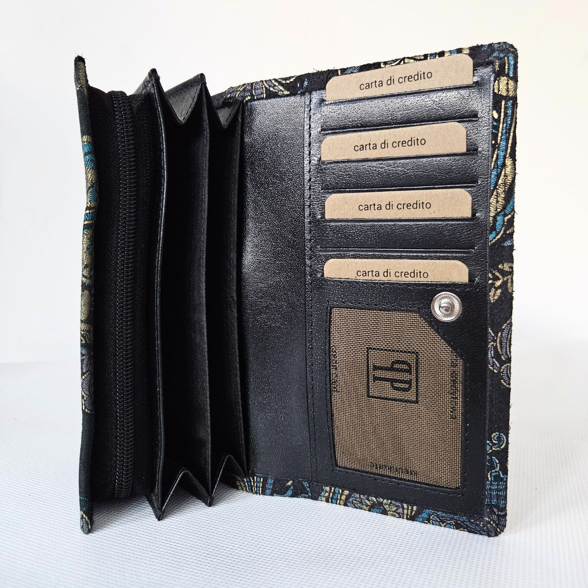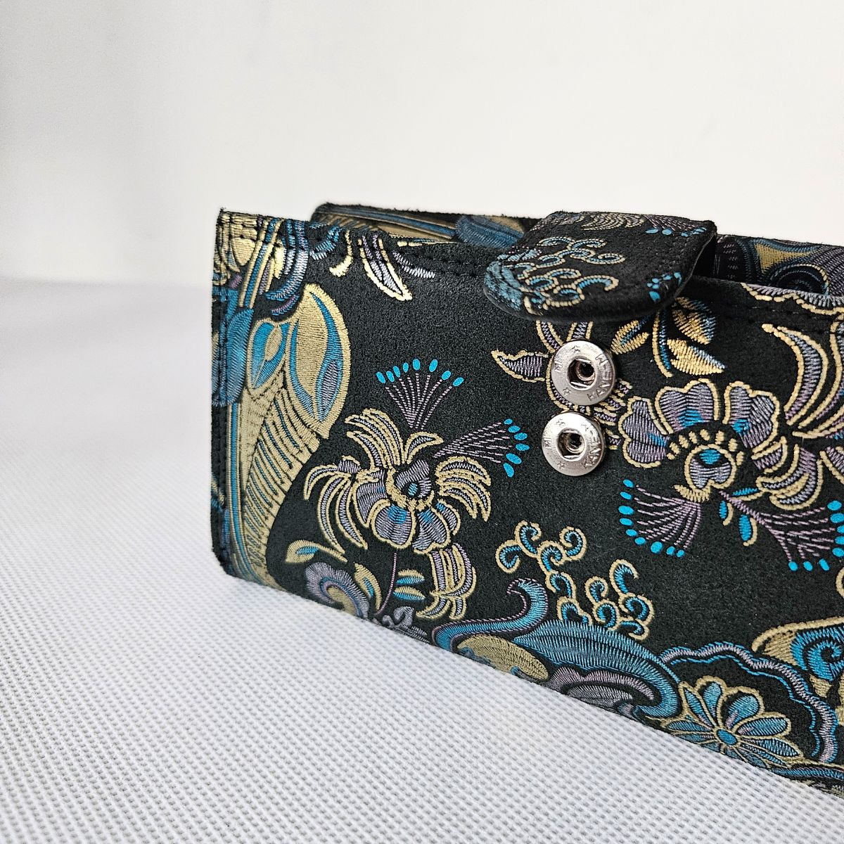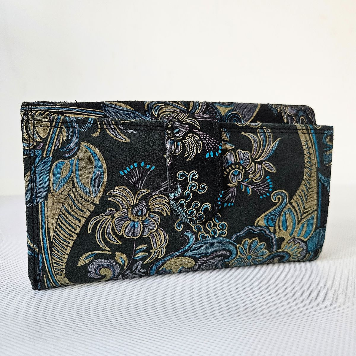 Veľká dámska kožená peňaženka s krásnou farebnou orientálnou potlačou. Vyrobená z kvalitnej pravej prírodnej kože. Peňaženka má zapínanie dvojitý patent (kovový cvok) a obsahuje priehradky na karty, bankovky, mince a fotografiu (sieťovaná priehradka). Mincovník sa zapína na zips a je rozdelený na dve časti. Zadná strana peňaženky má taktiež zapínanie na dvojitý patent a nájdete tam priehradky na karty a fotografiu (sieťovaná priehradka). Kovanie je striebornej farby. Peňaženka je zabalená v biologicky rozložiteľnej krabičke s logom značky, ideálna aj ako darček pre milovanú osobu.