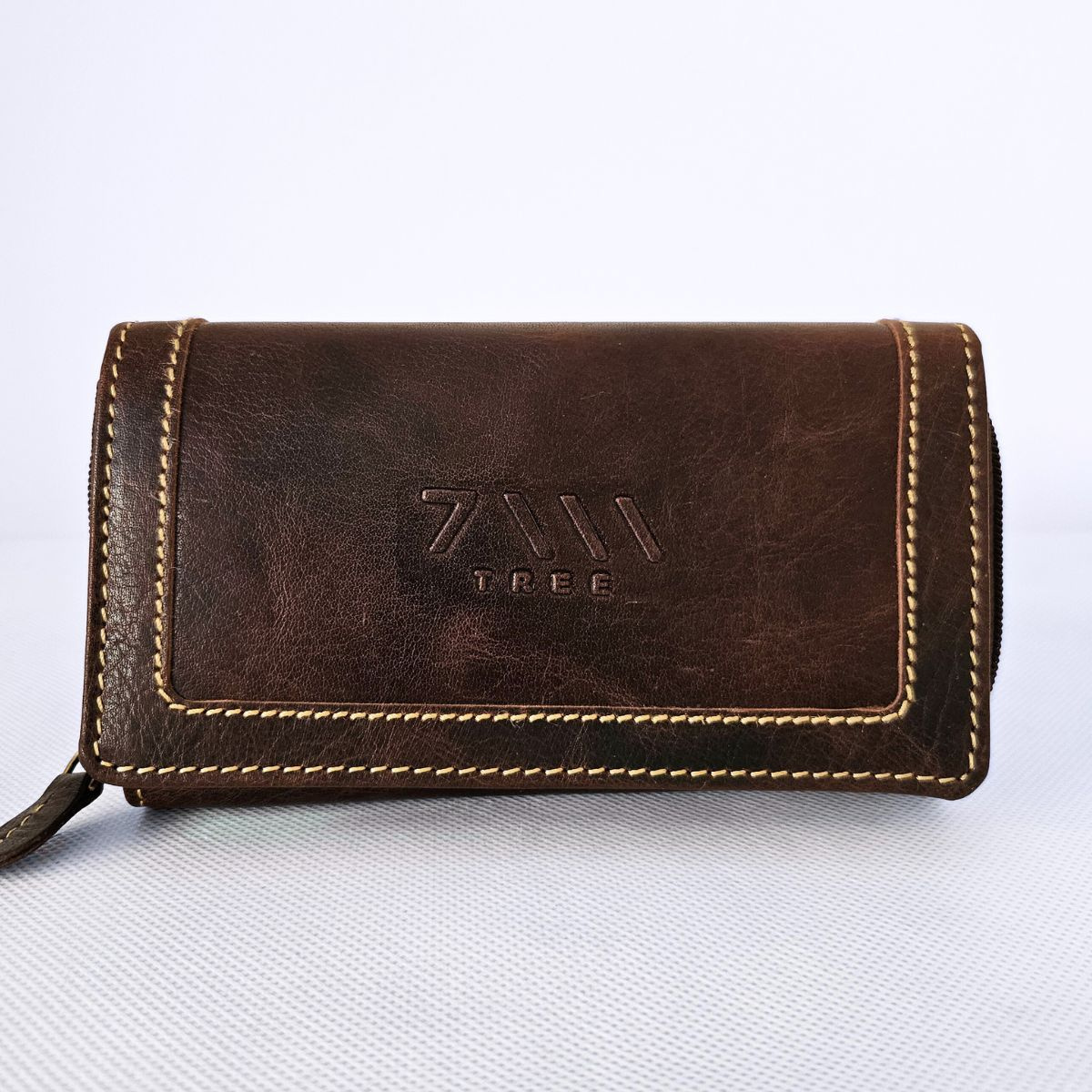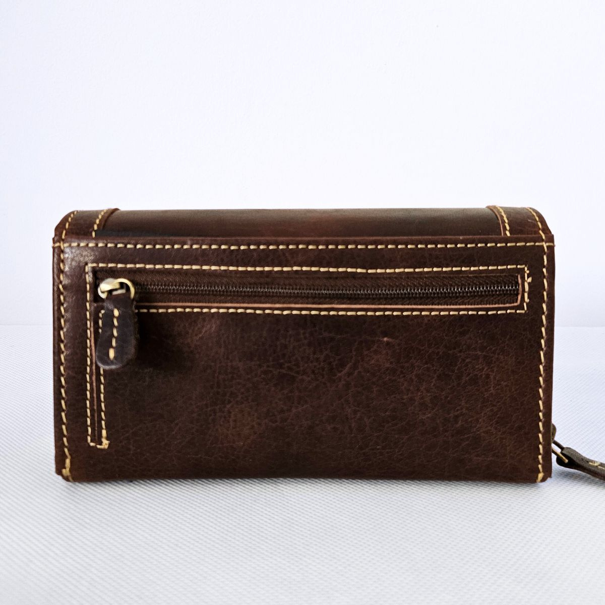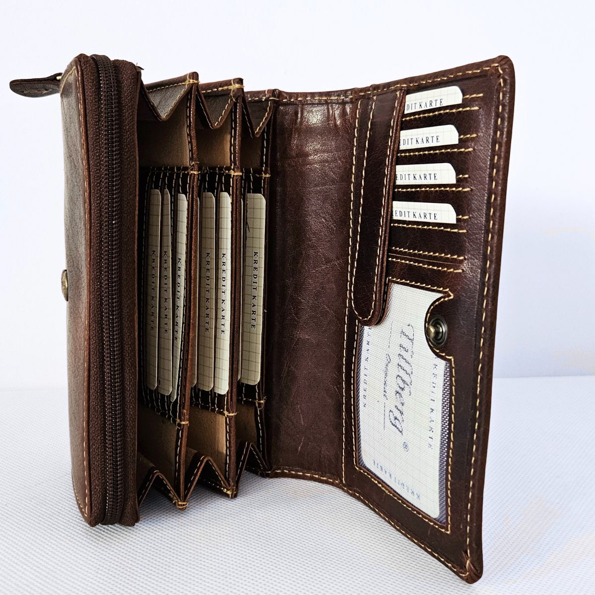 Veľká dámska kožená peňaženka v tmavohnedej farbe. Vyrobená z vysoko kvalitnej pravej byvolej kože. Peňaženka ponúka dostatok priestoru na všetky Vaše potrebné veci. Zapínanie je na patent - kovový cvok. Peňaženka obsahuje priehradky na karty, bankovky, mince a fotografiu (sieťovaná priehradka). Mincovník sa zapína na zips a je rozdelený na dve časti. Na zadnej strane peňaženky sa nachádza jedno otvorené vrecko a jedno vrecko na zips. Peňaženka má zabezpečenie RFID, ktoré chráni údaje na Vašich bezkontaktných kartách. Súčasťou peňaženky nie je krabička. Kovanie je mosadzné. Táto peňaženka je ideálna pre ženy, ktoré oceňujú kvalitné a vkusné doplnky - prvotriedna pravá koža, prepracované detaily, elegantný a nadčasový dizajn.