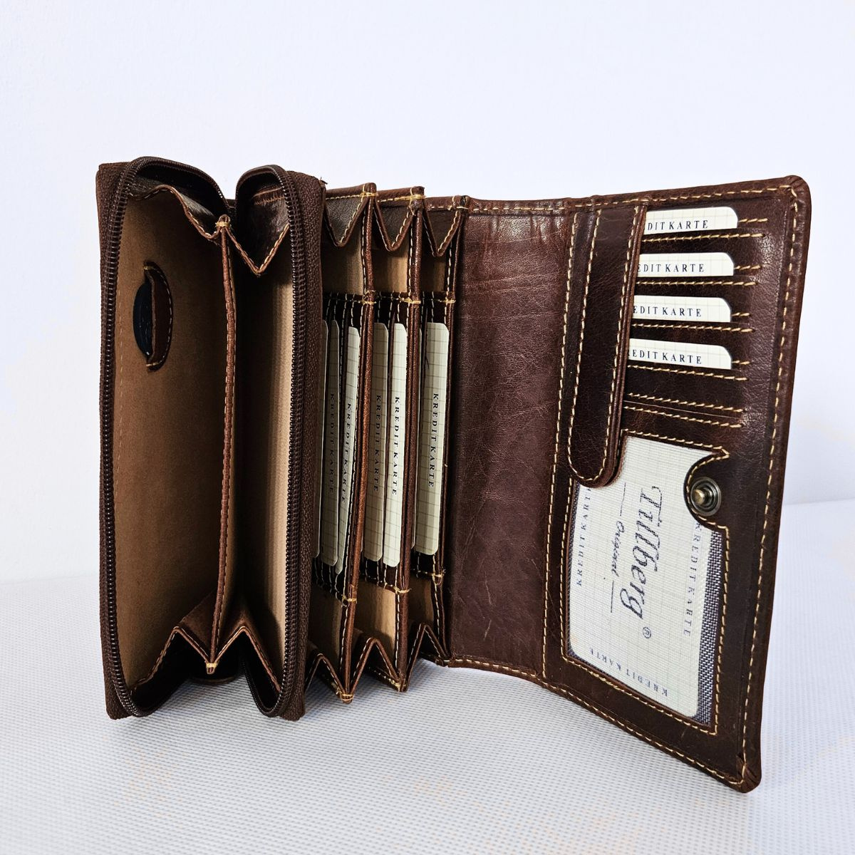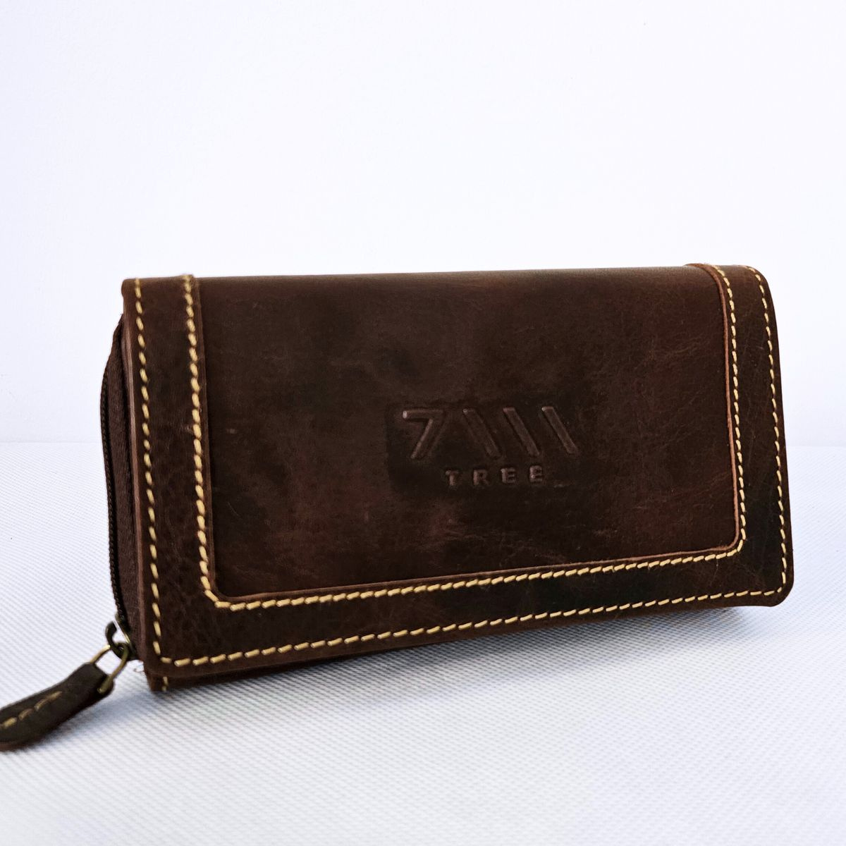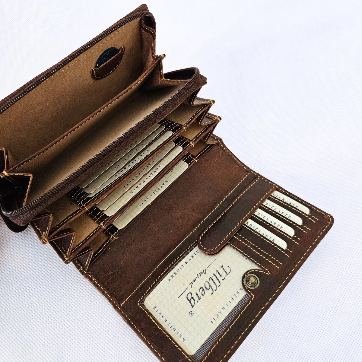 Veľká dámska kožená peňaženka v tmavohnedej farbe. Vyrobená z vysoko kvalitnej pravej byvolej kože. Peňaženka ponúka dostatok priestoru na všetky Vaše potrebné veci. Zapínanie je na patent - kovový cvok. Peňaženka obsahuje priehradky na karty, bankovky, mince a fotografiu (sieťovaná priehradka). Mincovník sa zapína na zips a je rozdelený na dve časti. Na zadnej strane peňaženky sa nachádza jedno otvorené vrecko a jedno vrecko na zips. Peňaženka má zabezpečenie RFID, ktoré chráni údaje na Vašich bezkontaktných kartách. Súčasťou peňaženky nie je krabička. Kovanie je mosadzné. Táto peňaženka je ideálna pre ženy, ktoré oceňujú kvalitné a vkusné doplnky - prvotriedna pravá koža, prepracované detaily, elegantný a nadčasový dizajn.