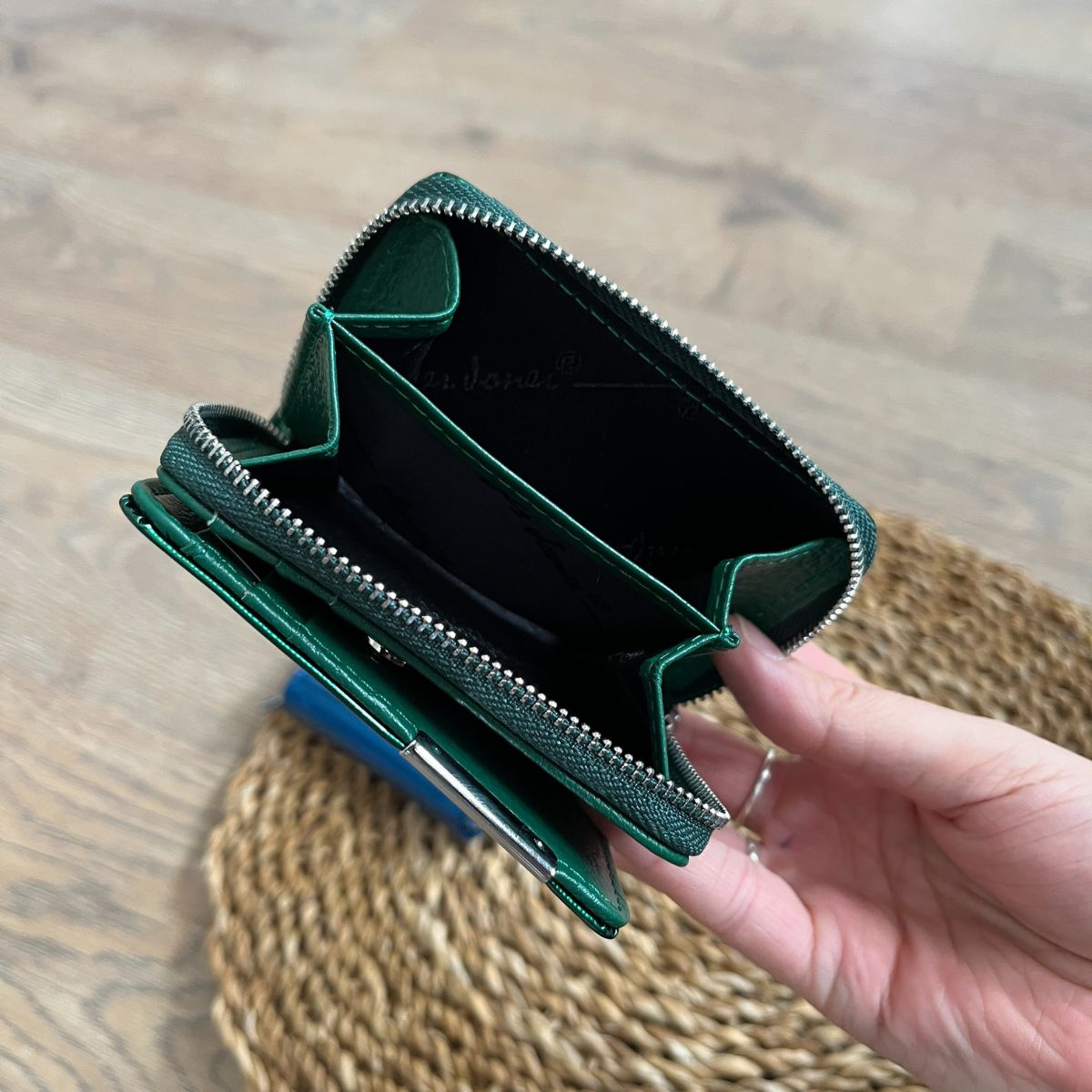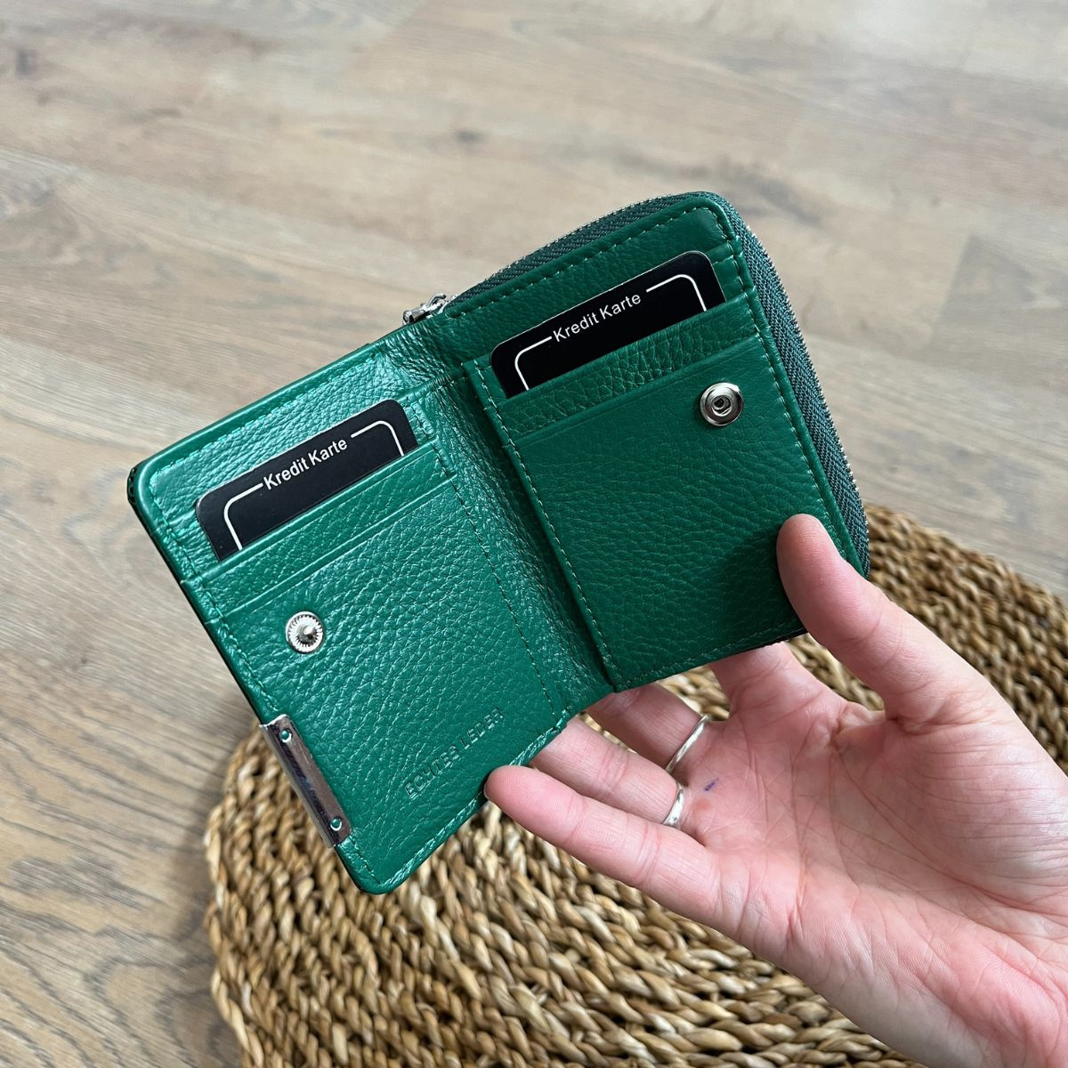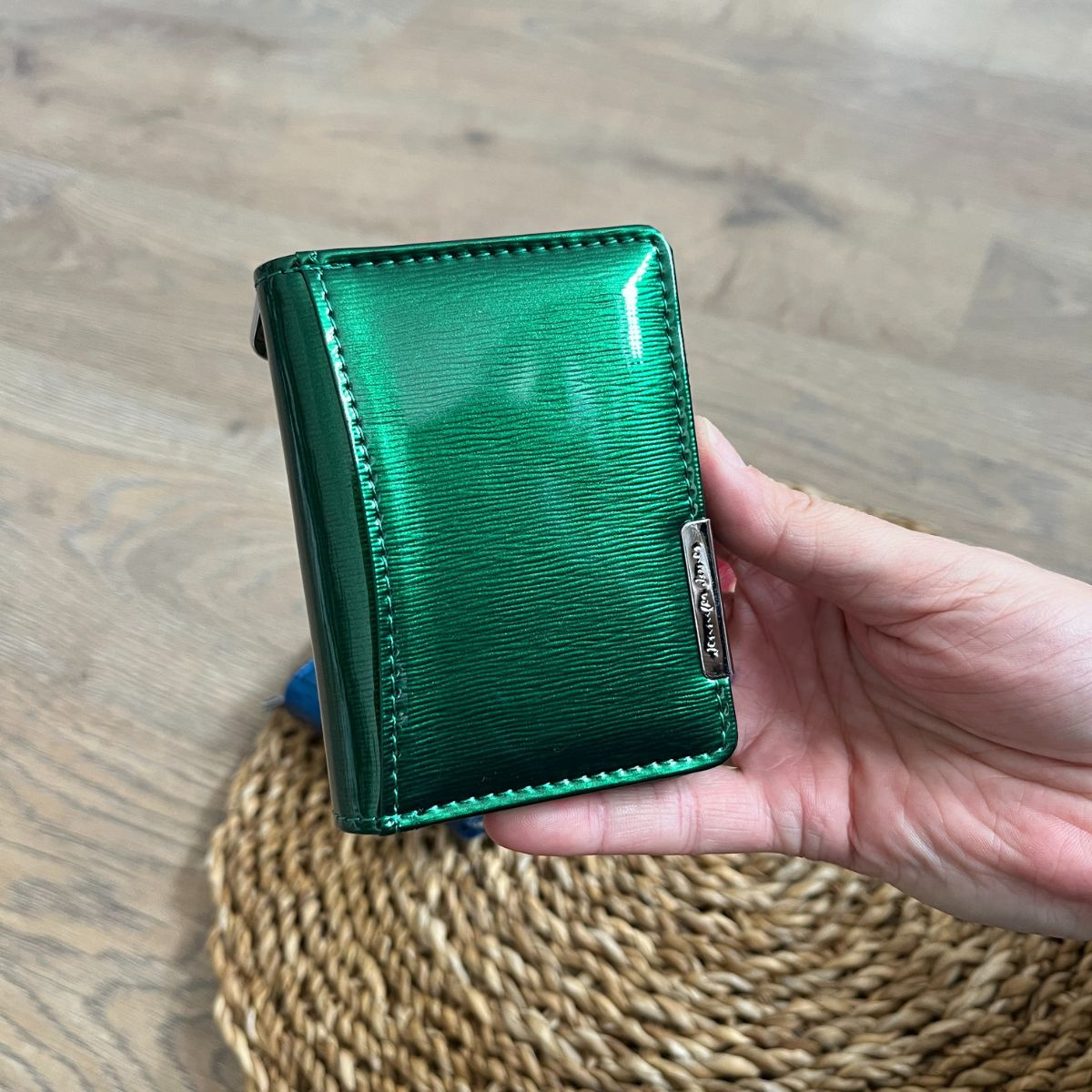 Malá dámska kožená lakovaná peňaženka v nádhernej zelenej farbe. Vyrobená z kvalitnej pravej prírodnej kože. Vonkajšia časť peňaženky je jemne vrúbkovaná. Peňaženka má dve oddelené časti. Prvá časť má zapínanie na patent (kovový cvok) a obsahuje priehradky na karty a bankovky. Druhá časť - mincovník - má zapínanie na zips a je rozdelený na dve časti. Na zadnej strane peňaženky je priesvitná priehradka, napríklad na fotografiu. Súčasťou peňaženky nie je krabička. Kovanie peňaženky je v striebornej farbe. Táto krásna mini peňaženka je obľúbeným dámskym doplnkom, nakoľko sa zmestí aj do menšej kabelky alebo ľadvinky.