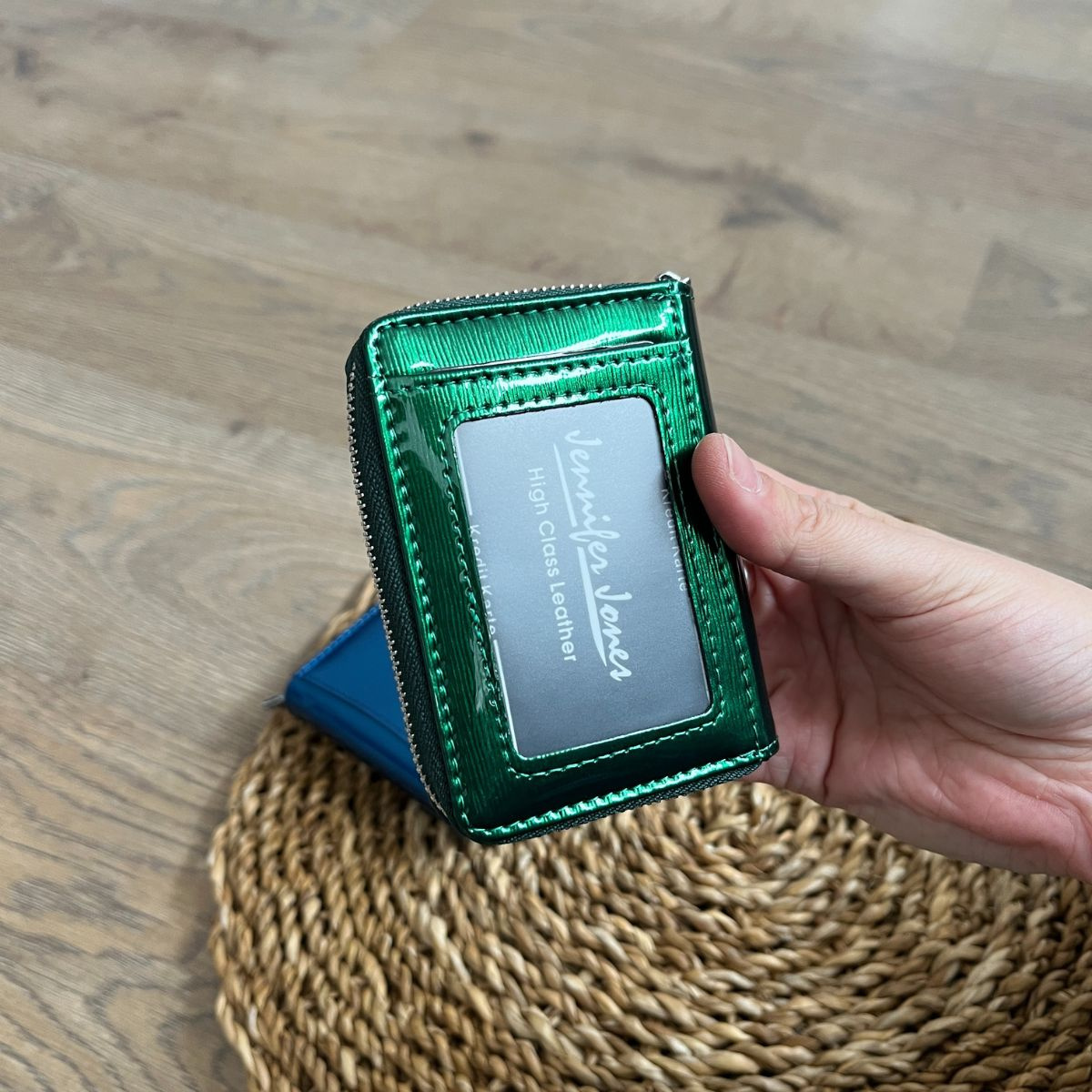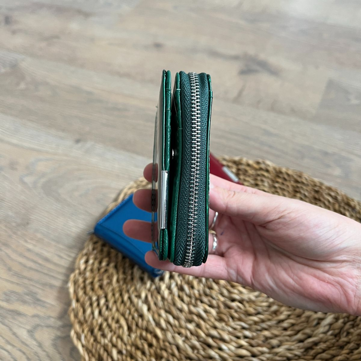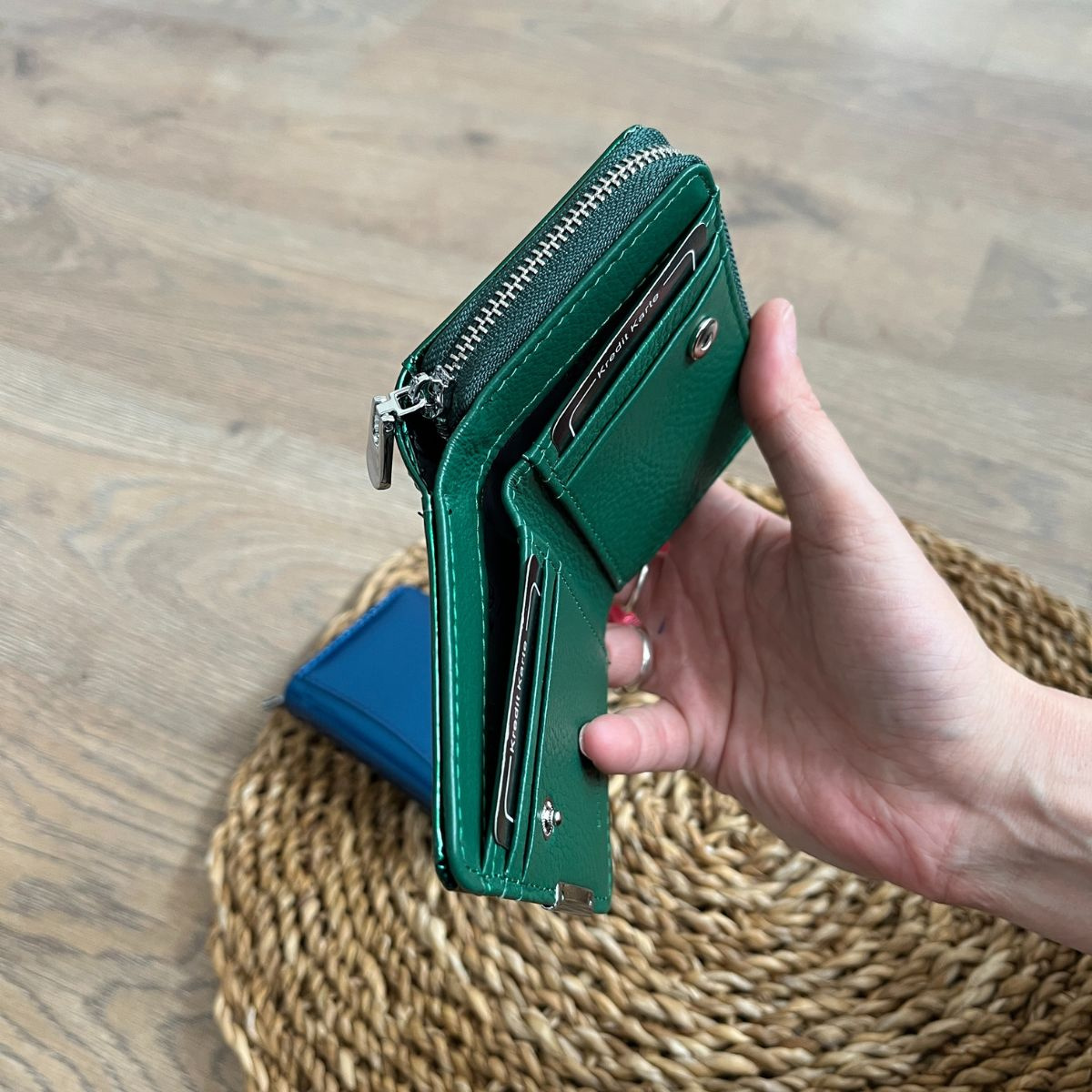 Malá dámska kožená lakovaná peňaženka v nádhernej zelenej farbe. Vyrobená z kvalitnej pravej prírodnej kože. Vonkajšia časť peňaženky je jemne vrúbkovaná. Peňaženka má dve oddelené časti. Prvá časť má zapínanie na patent (kovový cvok) a obsahuje priehradky na karty a bankovky. Druhá časť - mincovník - má zapínanie na zips a je rozdelený na dve časti. Na zadnej strane peňaženky je priesvitná priehradka, napríklad na fotografiu. Súčasťou peňaženky nie je krabička. Kovanie peňaženky je v striebornej farbe. Táto krásna mini peňaženka je obľúbeným dámskym doplnkom, nakoľko sa zmestí aj do menšej kabelky alebo ľadvinky.