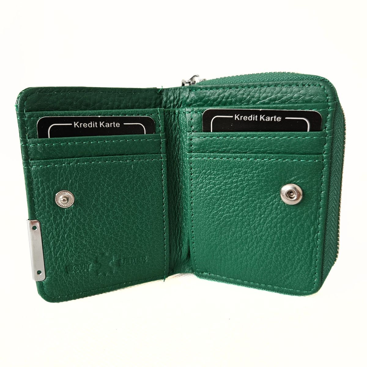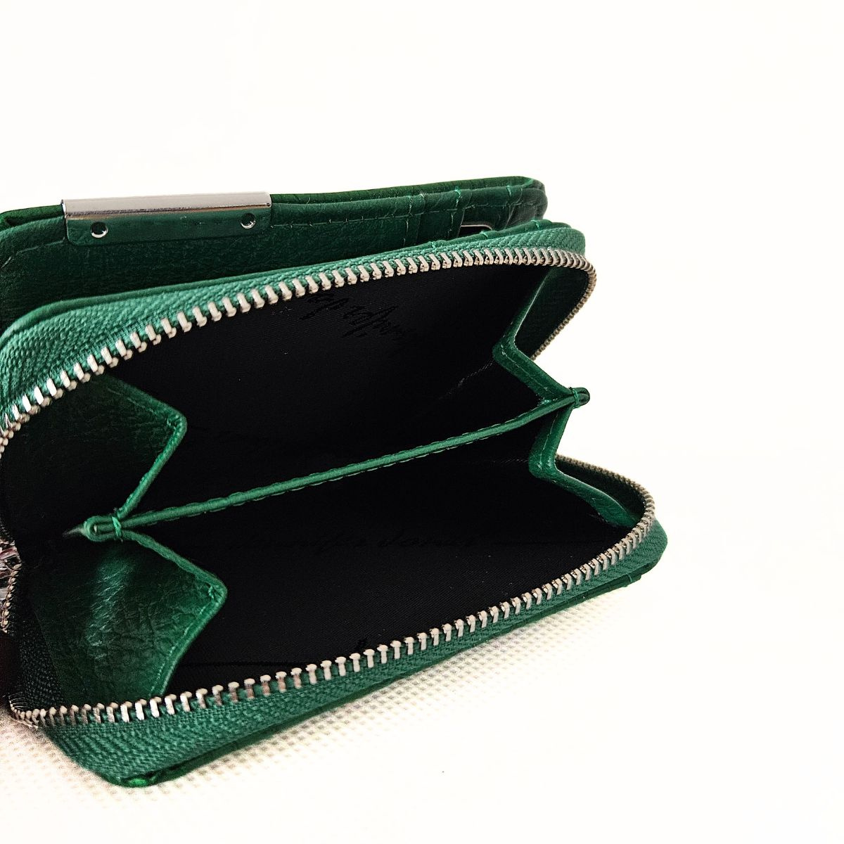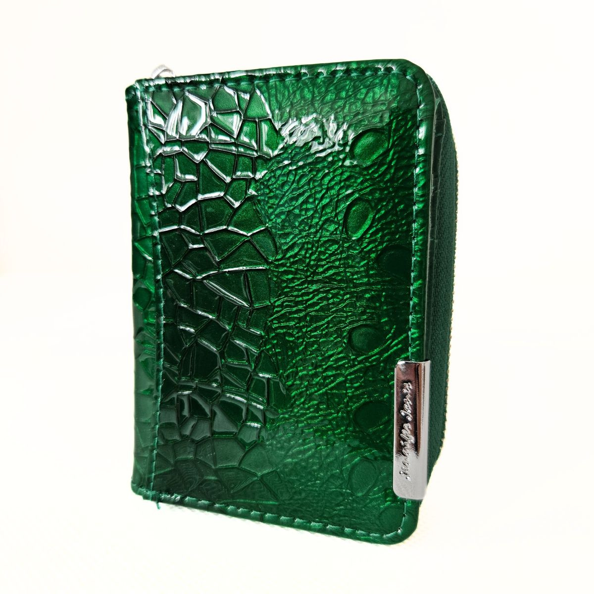 Malá dámska kožená lakovaná peňaženka v zelenej farbe s krásnym dizajnom. Peňaženka má dve samostatné časti. Jedna časť má zapínanie na patent (kovový cvok) a obsahuje priehradky na karty a bankovky. Mincovník má zapínanie na zips a je rozdelený na dve časti. Na zadnej strane peňaženky je priesvitná priehradka, napríklad na fotografiu. Súčasťou peňaženky nie je krabička. Kovanie peňaženky je v striebornej farbe. Táto nádherná peňaženka je skvelý dámsky doplnok, nakoľko sa zmestí aj do menšej kabelky alebo ľadvinky.