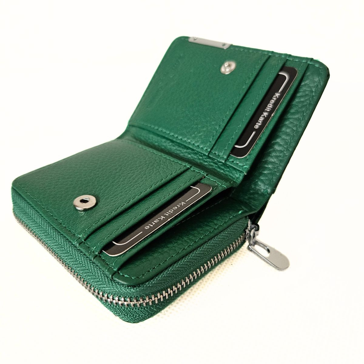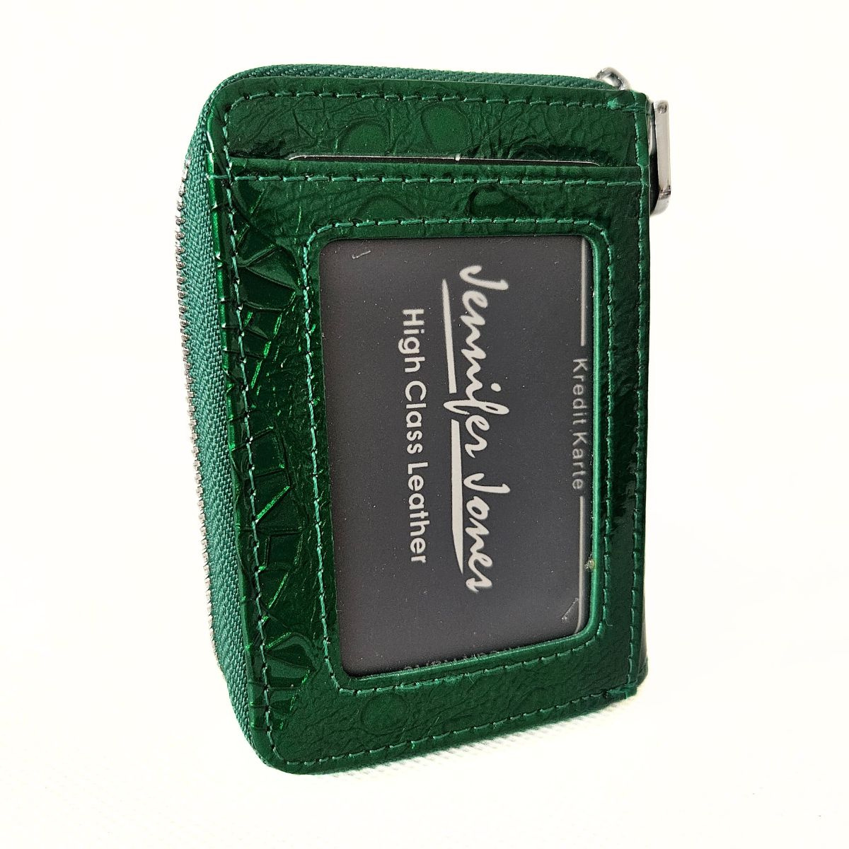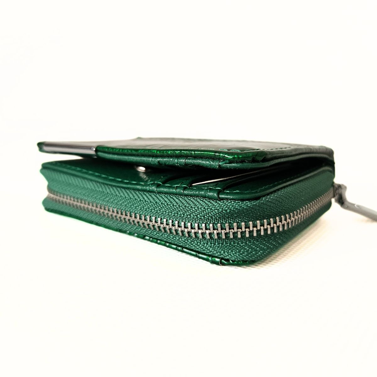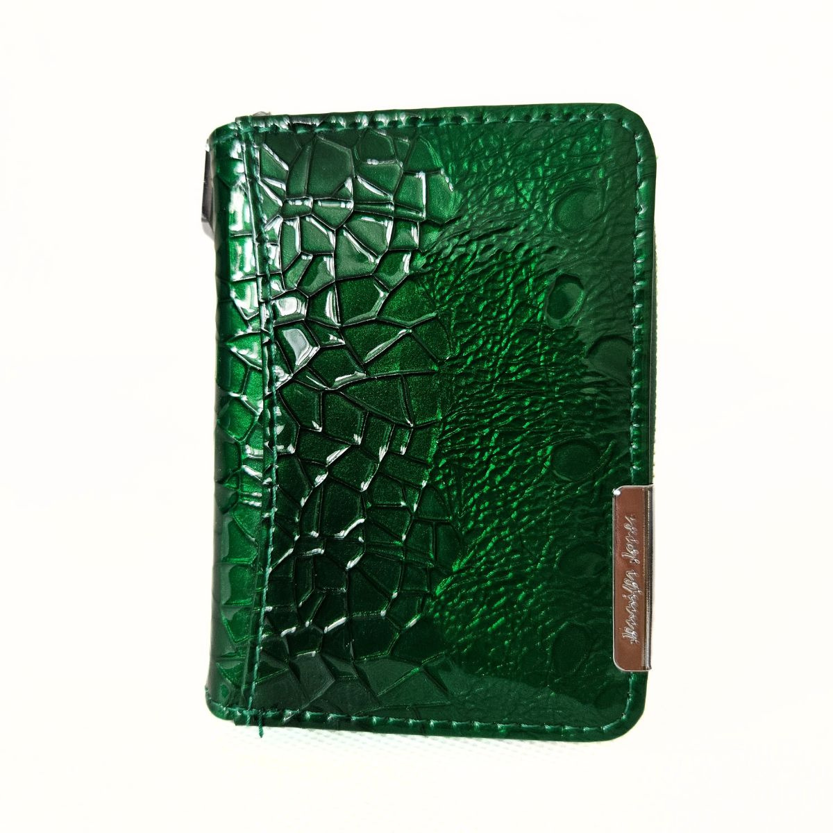 Malá dámska kožená lakovaná peňaženka v zelenej farbe s krásnym dizajnom. Peňaženka má dve samostatné časti. Jedna časť má zapínanie na patent (kovový cvok) a obsahuje priehradky na karty a bankovky. Mincovník má zapínanie na zips a je rozdelený na dve časti. Na zadnej strane peňaženky je priesvitná priehradka, napríklad na fotografiu. Súčasťou peňaženky nie je krabička. Kovanie peňaženky je v striebornej farbe. Táto nádherná peňaženka je skvelý dámsky doplnok, nakoľko sa zmestí aj do menšej kabelky alebo ľadvinky.